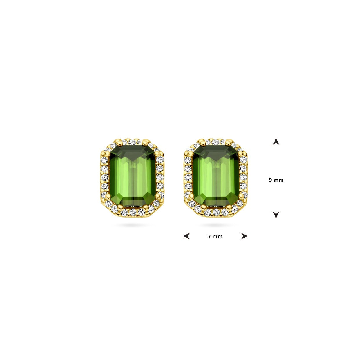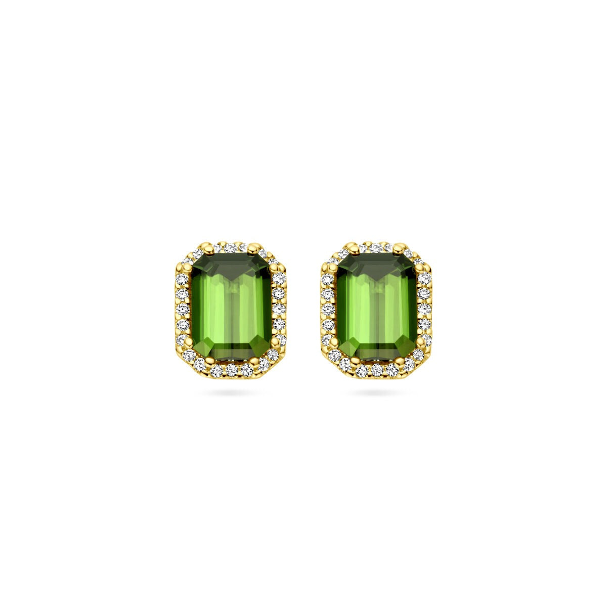 Deze 14k geelgouden oorknoppen combineren natuurlijke elegantie met verfijnde luxe. In het hart schittert een diepgroene toermalijn, emerald geslepen voor een krachtige, heldere uitstraling. De steen wordt omlijst door een sprankelende diamantaccent van in totaal 0.14 karaat, gezet in een klassieke 4-poots chatonzetting, waardoor de natuurlijke schoonheid van beide stenen volledig tot zijn recht komt.