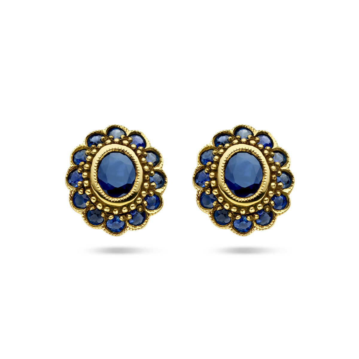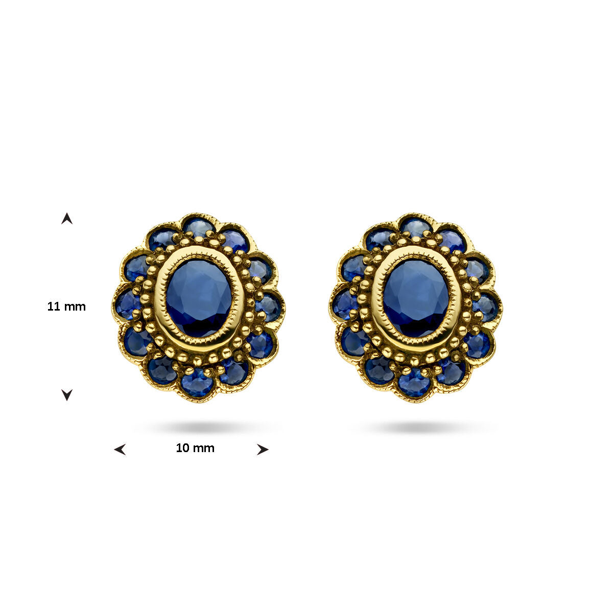14k Geelgouden oorknoppen uitgevoerd met saffier stenen. De oorknoppen hebben een afmeting van 11x10mm.