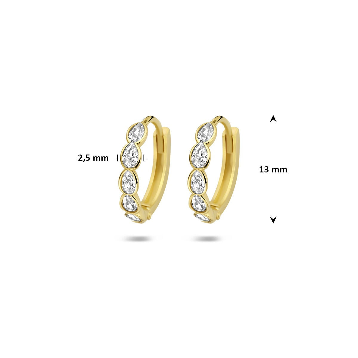 De stenen zijn peer geslepen en gezet in een klassieke entourage-vorm met zetkast, wat de uitstraling van de oorringen versterkt zonder te overdrijven. De warme goudkleur vormt een elegant contrast met de heldere zirkonia’s, wat deze oorringen zowel tijdloos als vrouwelijk maakt.