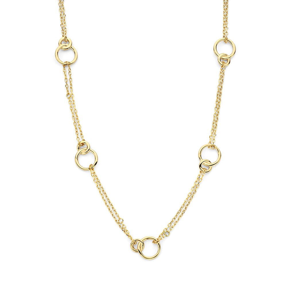 Geelgouden collier met dubbele schakelketting en verbonden cirkels.