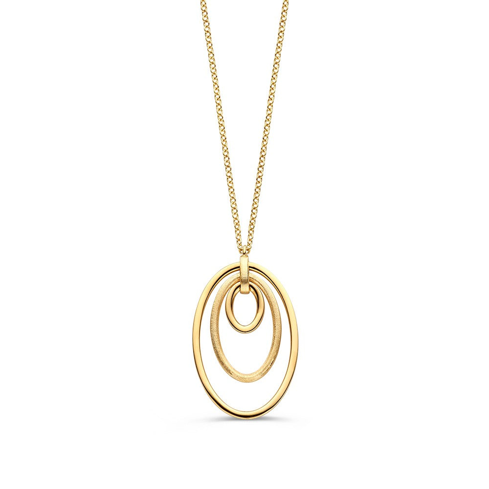 Geelgouden collier met opvallende hanger van drie ovale elementen die in elkaar vallen. Het middelste element is gematteerd afgewerkt.