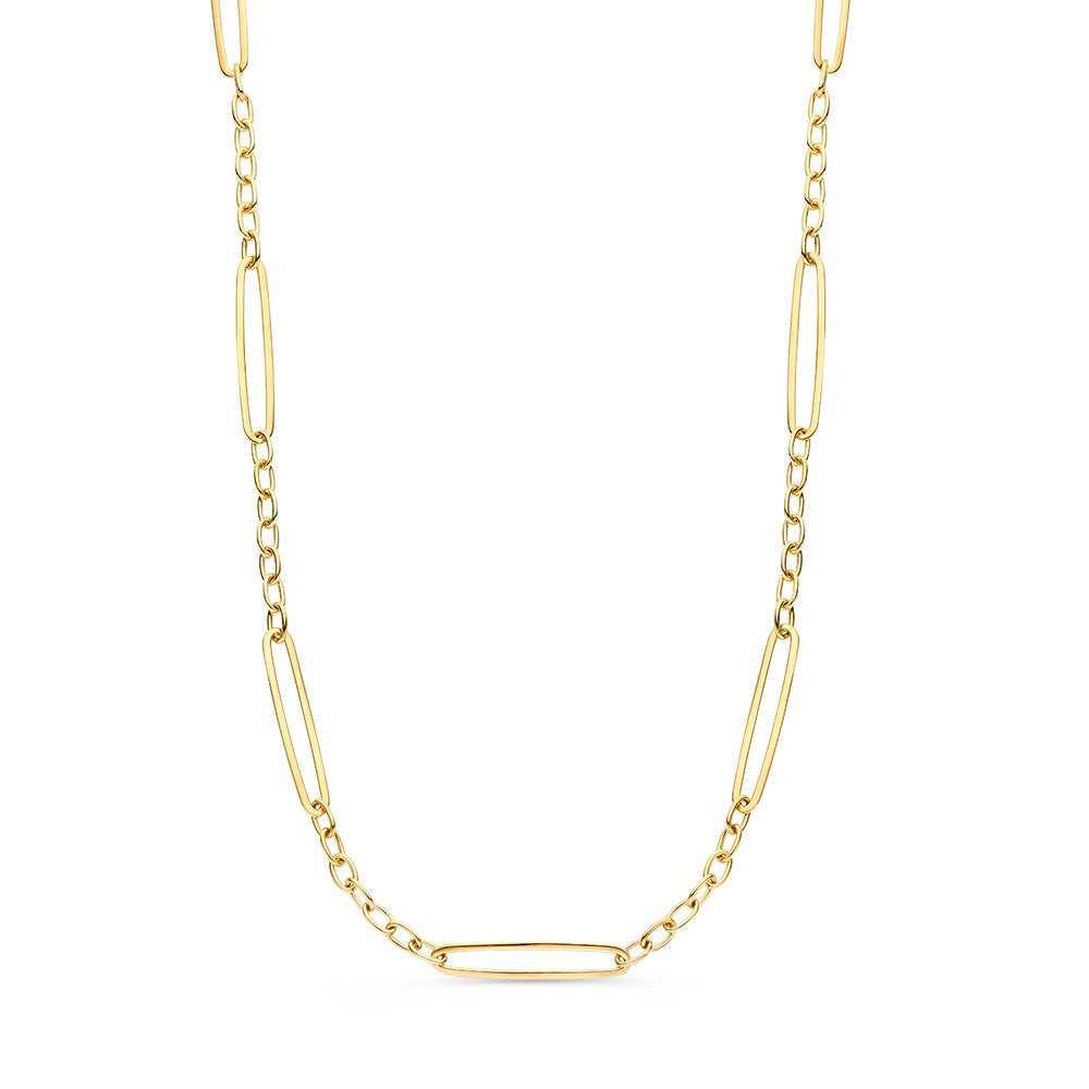 Speels geelgouden schakelcollier, met ovale schakels van verschillende groottes.