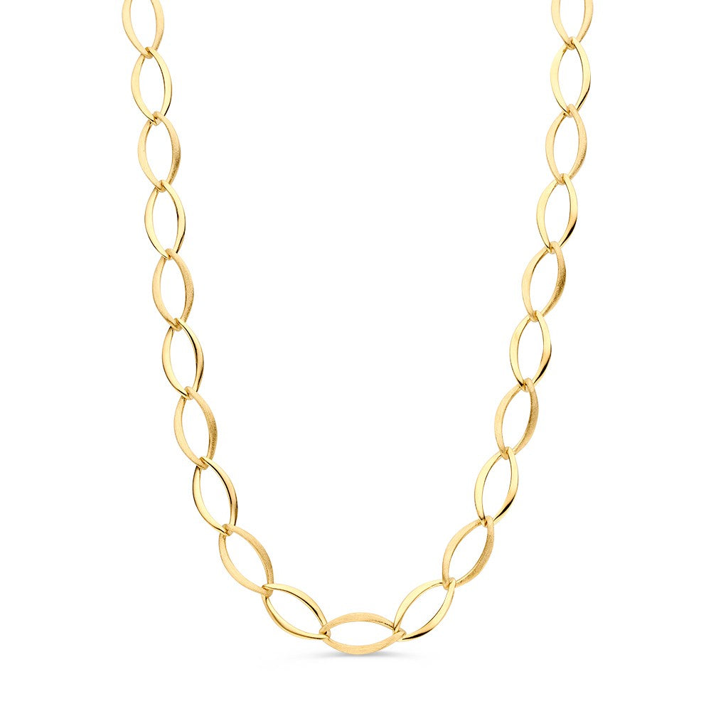 Speels, geelgouden schakelcollier waarbij de schakels om en om een gepolijste en een gematteerde afwerking hebben.