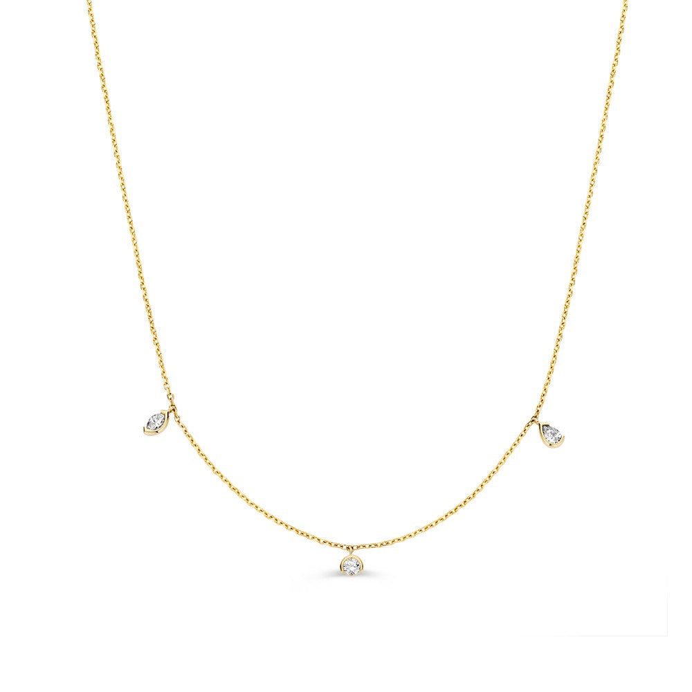 Verfijnd en speels collier met drie diamanten in open bezel zetting, de diamanten hebben ieder een eigen slijpvorm: briljant, markies en peer.