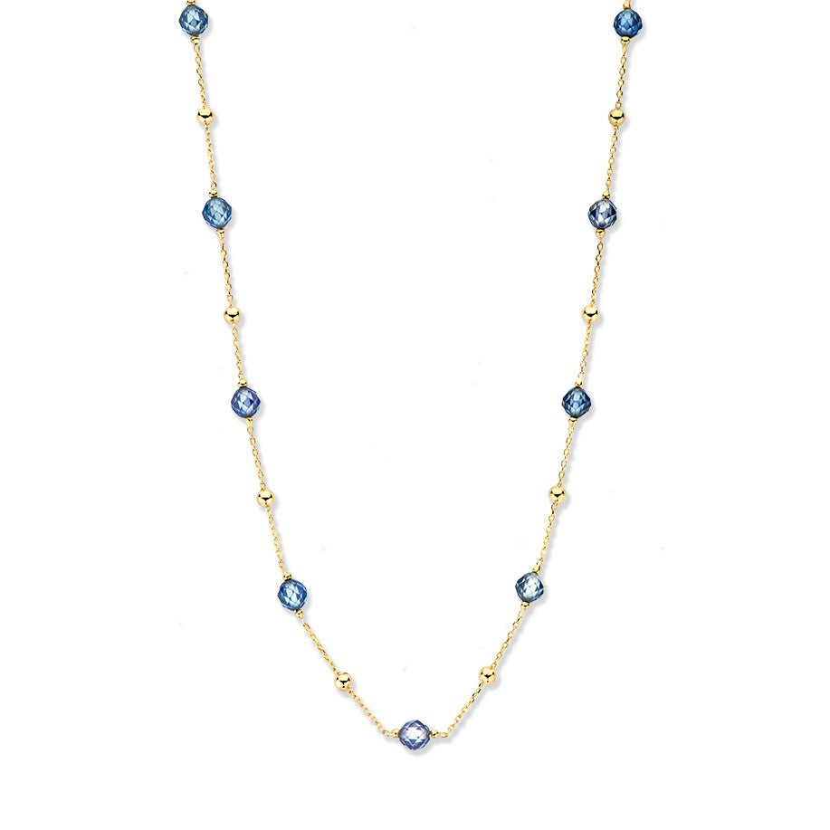 Geelgouden collier met gouden en blauwe zirkonia bolletjes.