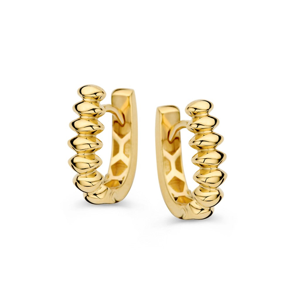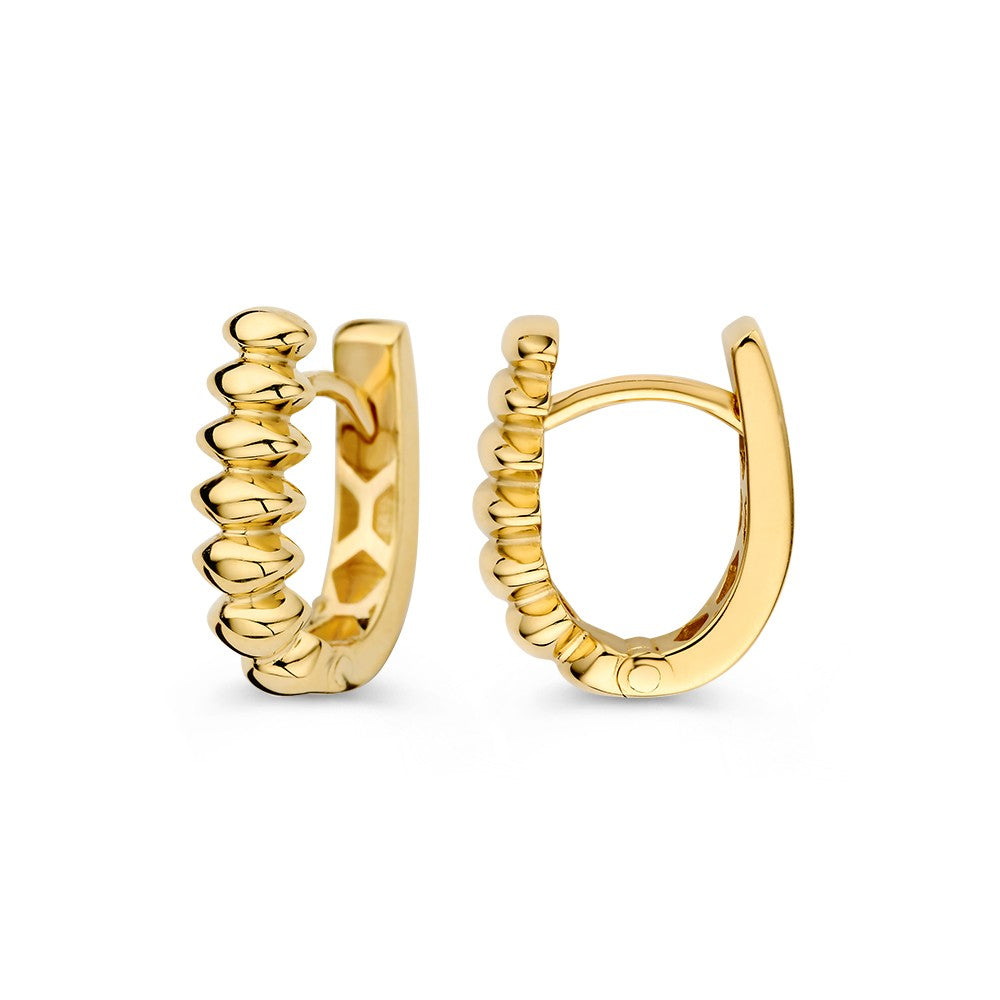 Geelgouden oorringen met speelse ribbelbewerking aan de voorzijde.