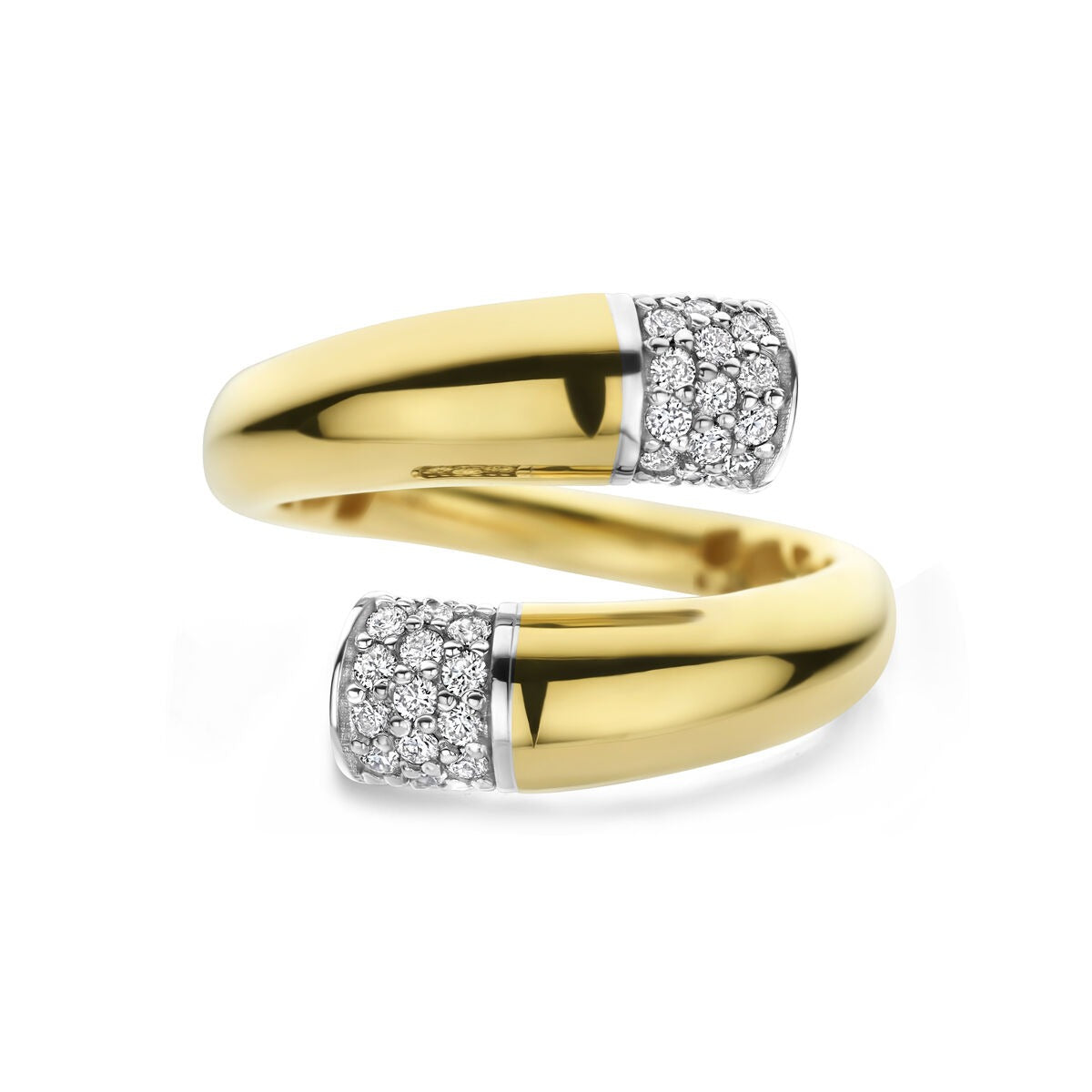 Deze indrukwekkende dames ring van 14k bicolor goud is een sieraad met allure. Het samenspel van warm geelgoud en koel witgoud vormt een krachtig contrast, dat nog extra tot leven komt door de schittering van in totaal 0.30 ct briljant geslepen diamanten. De stenen zijn verfijnd gezet in een luxe pavézetting, waardoor het oppervlak fonkelt bij elke beweging.