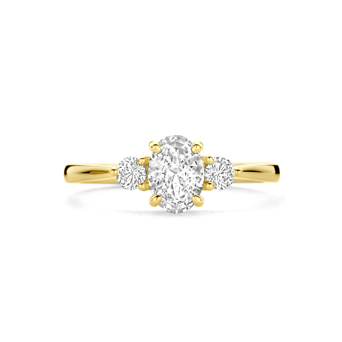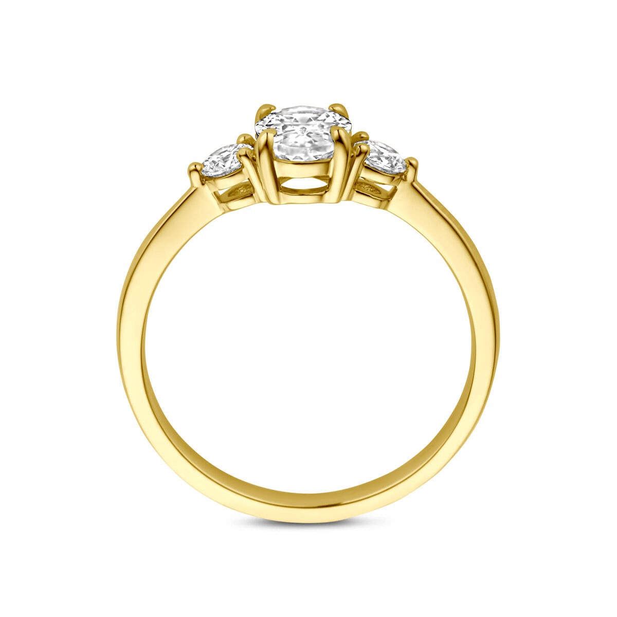 Deze 14k geelgouden ring met zirkonia is een opvallend sieraad met een klassieke allure. De centrale ovaal geslepen zirkonia wordt omringd door kleinere stenen in een elegante entouragezetting, waardoor een rijk en sprankelend geheel ontstaat. De transparante zirkonia’s zijn gezet in een verfijnde 4-poots chaton, wat de schittering van de stenen optimaal naar voren laat komen.