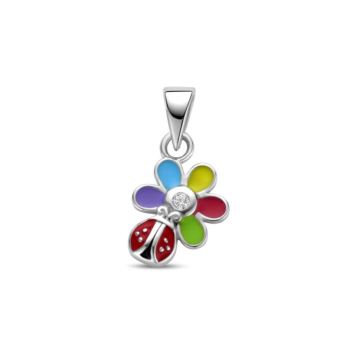 Vrolijk, kleurrijk en betoverend – deze gerhodineerd 925 zilveren hanger is een feestelijk sieraad voor kinderen. Het ontwerp bestaat uit een bloem met gekleurde emaille blaadjes in geel, groen, lichtblauw en paars, versierd met een fonkelende transparante zirkonia in briljantslijpvorm. Een schattig rood met zwart lieveheersbeestje maakt het geheel speels en levendig.