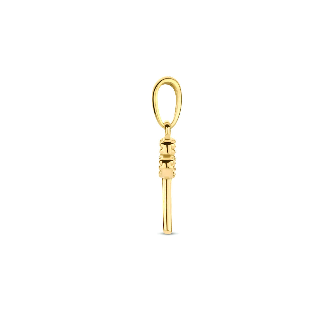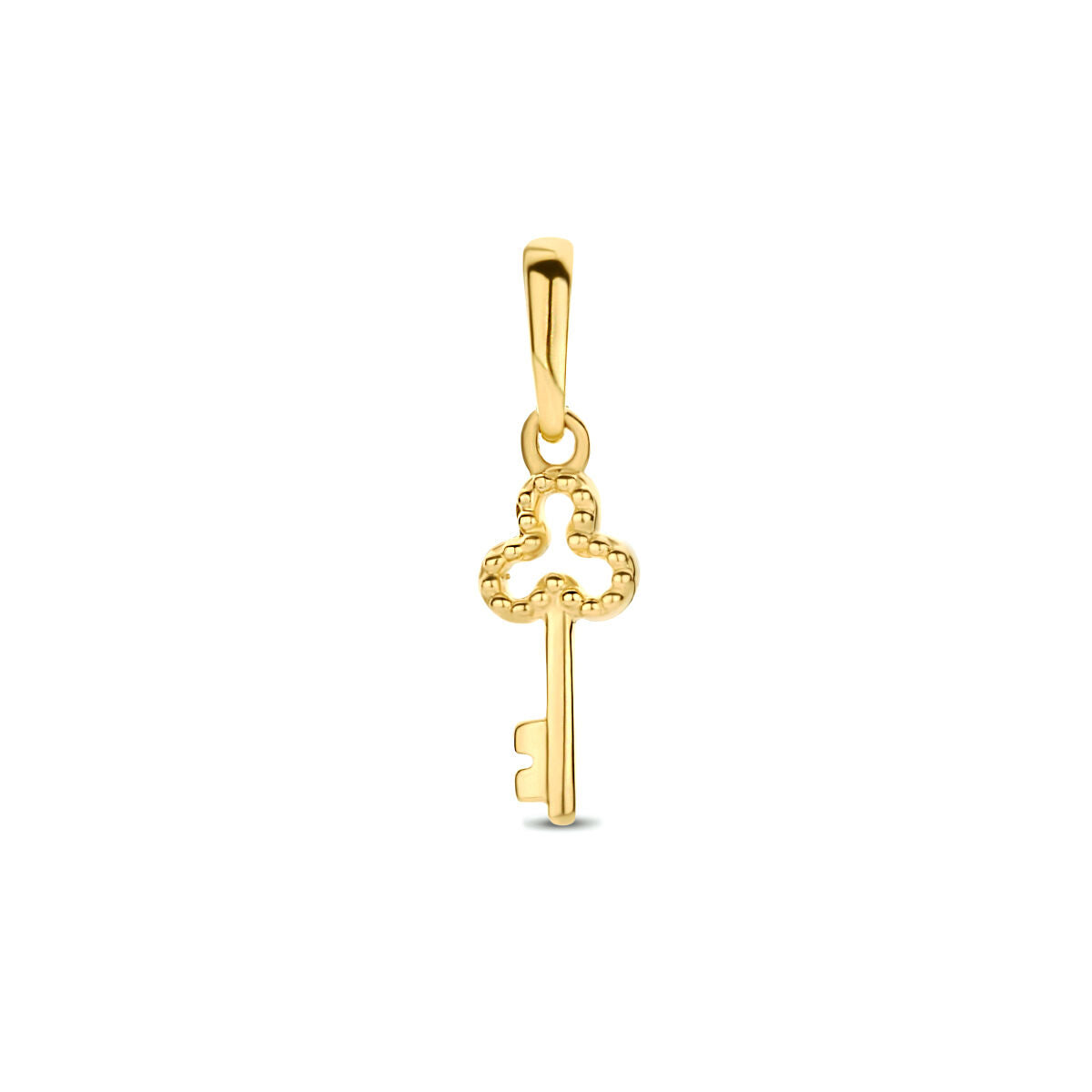 14k Geelgouden hanger in de vorm van een sleutel. De hanger heeft een totale hoogte van 1.7cm en de sleutel heeft een afmeting van 11.5x4.5mm.