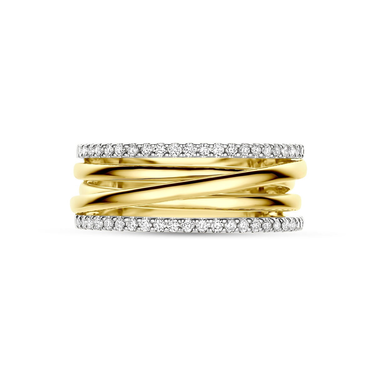 Een sieraad vol allure – deze gouden ring met diamant combineert de klassieke warmte van 14 karaat geelgoud met de moderne elegantie van witgoud. Het bicolor design geeft de ring een eigentijdse uitstraling, perfect voor de vrouw die houdt van verfijning met karakter. In het midden schitteren briljant geslepen diamanten, subtiel geplaatst in een rijzetting. Samen vormen ze een fonkelende lijn van 0.28 karaat, die het licht prachtig reflecteert.