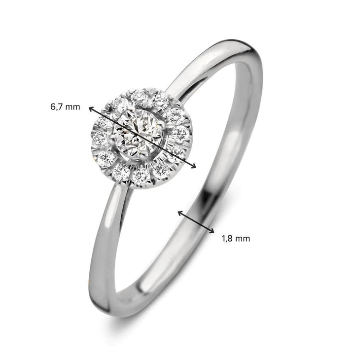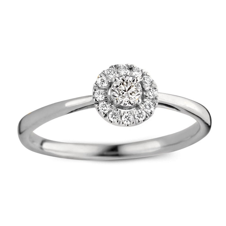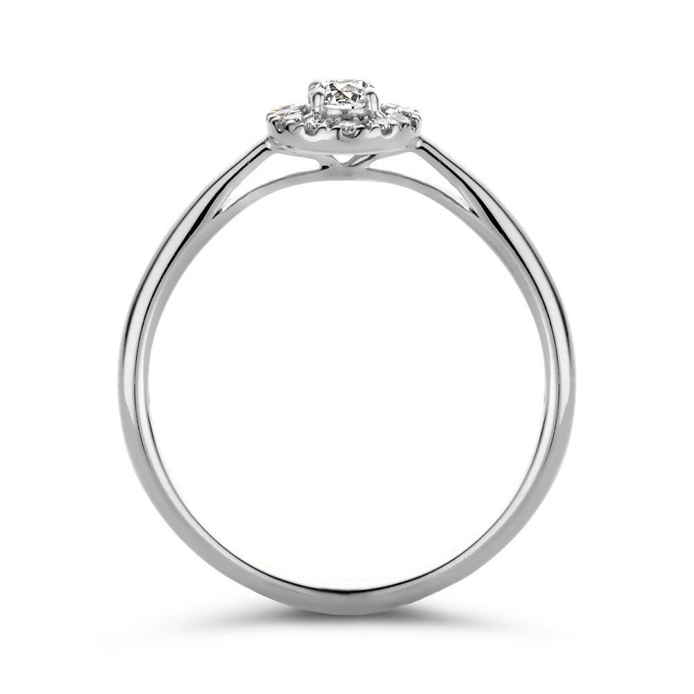 Dankzij haar stijlvolle en luxe uitstraling is ring Emma één van onze populairste ringmodellen. De ring heeft een schitterende entourage zetting. De ronde middensteen (briljant geslepen) wordt hierbij omringd door kleinere briljanten. De ring heeft een sierlijke verhoogde zetting, waardoor hij perfect gecombineerd kan worden met een gladde of diamanten rijring. Combineer haar bijvoorbeeld met de verfijnde Millie ring.