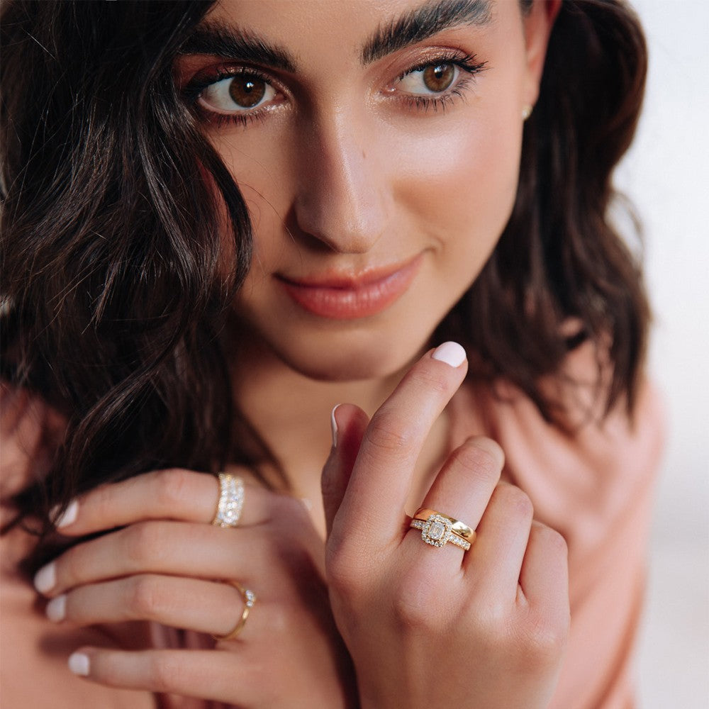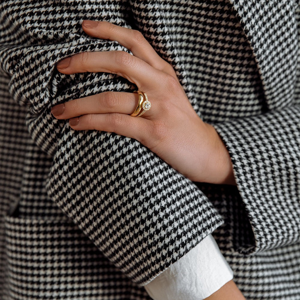 Uiteraard volledig gecreëerd met duurzame materialen. We gebruiken uitsluitend 18 karaat gerecycled goud voor de trouwringen. En alle trouwringen en verlovingsringen zijn dankzij hun vorm perfect te combineren zijn met de andere ringen uit de Aurore collectie.