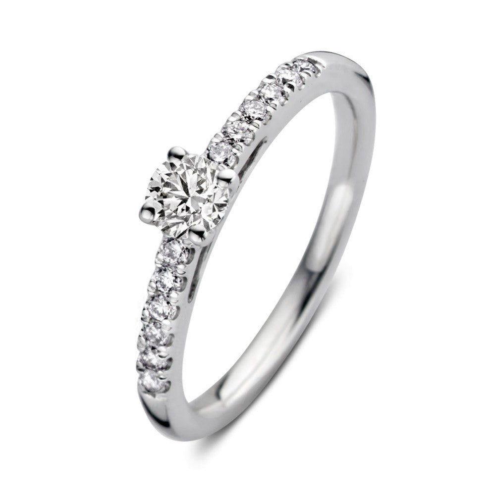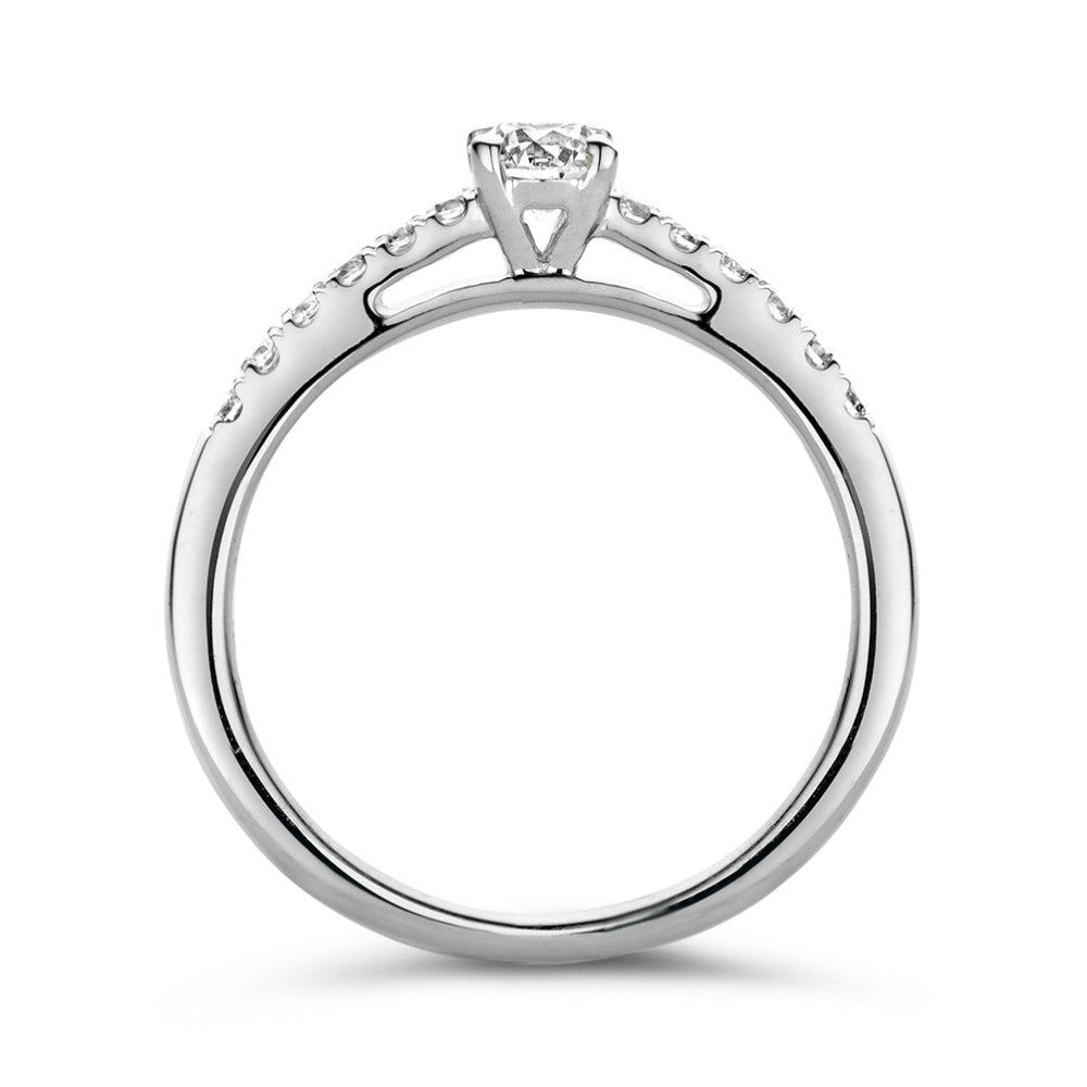 Ring Mary is een absoluut plaatje om te zien. Deze moderne klassieker bevat een prachtige briljant in vierpootszetting omgeven door fijnere briljanten in de scheen. Dankzij de open zetting vangt de diamant veel licht en schittert hij optimaal. Mary is prachtig te combineren met  een gladde of diamanten rijring. Probeer haar voor extra sparkle bijvoorbeeld eens samen met ring Millie.