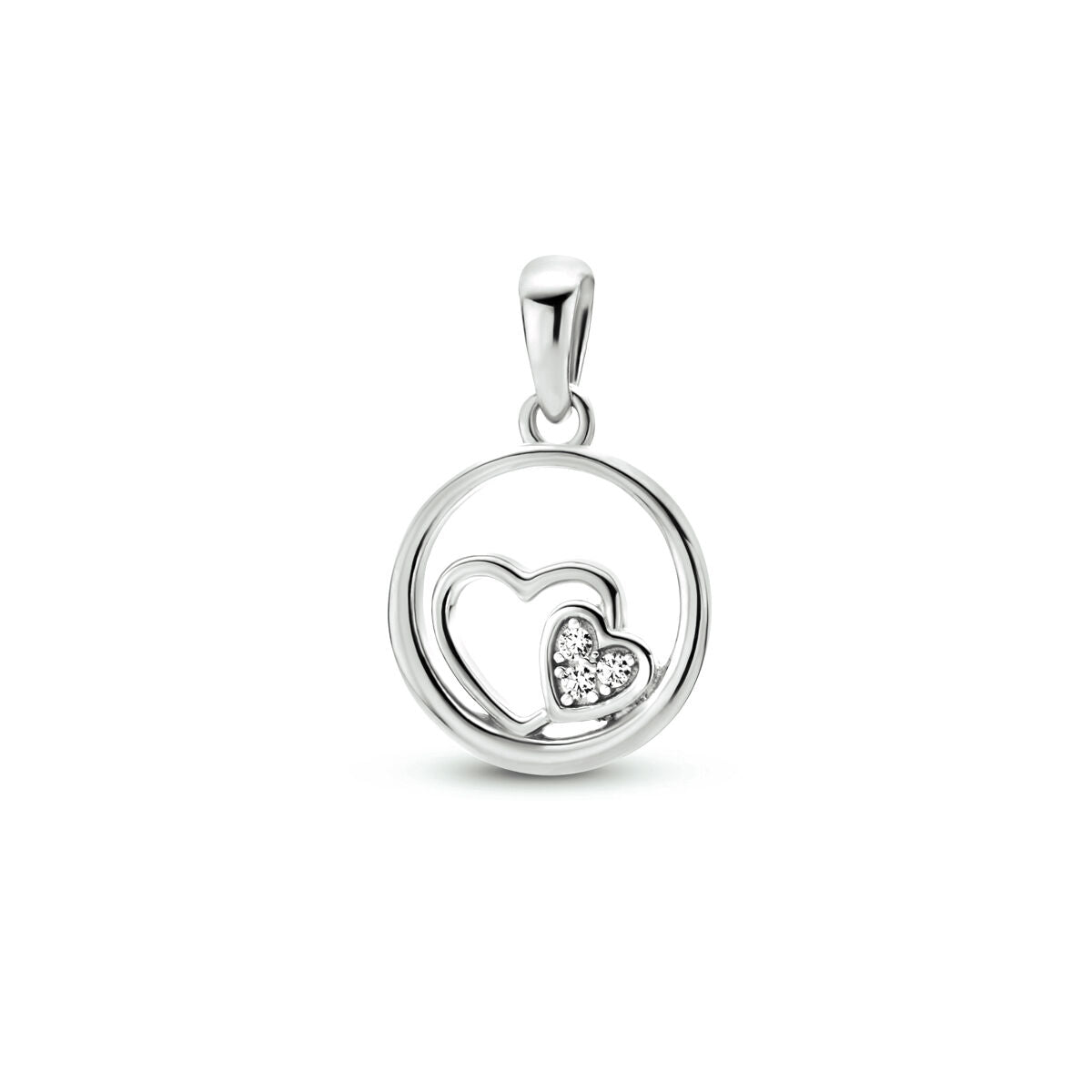Gerhodineerd 925 zilveren hanger uitgevoerd met twee hartjes en een schitterend zirkonia vlak. De hanger heeft een totale hoogte van 1.8cm en een diameter van 12mm.