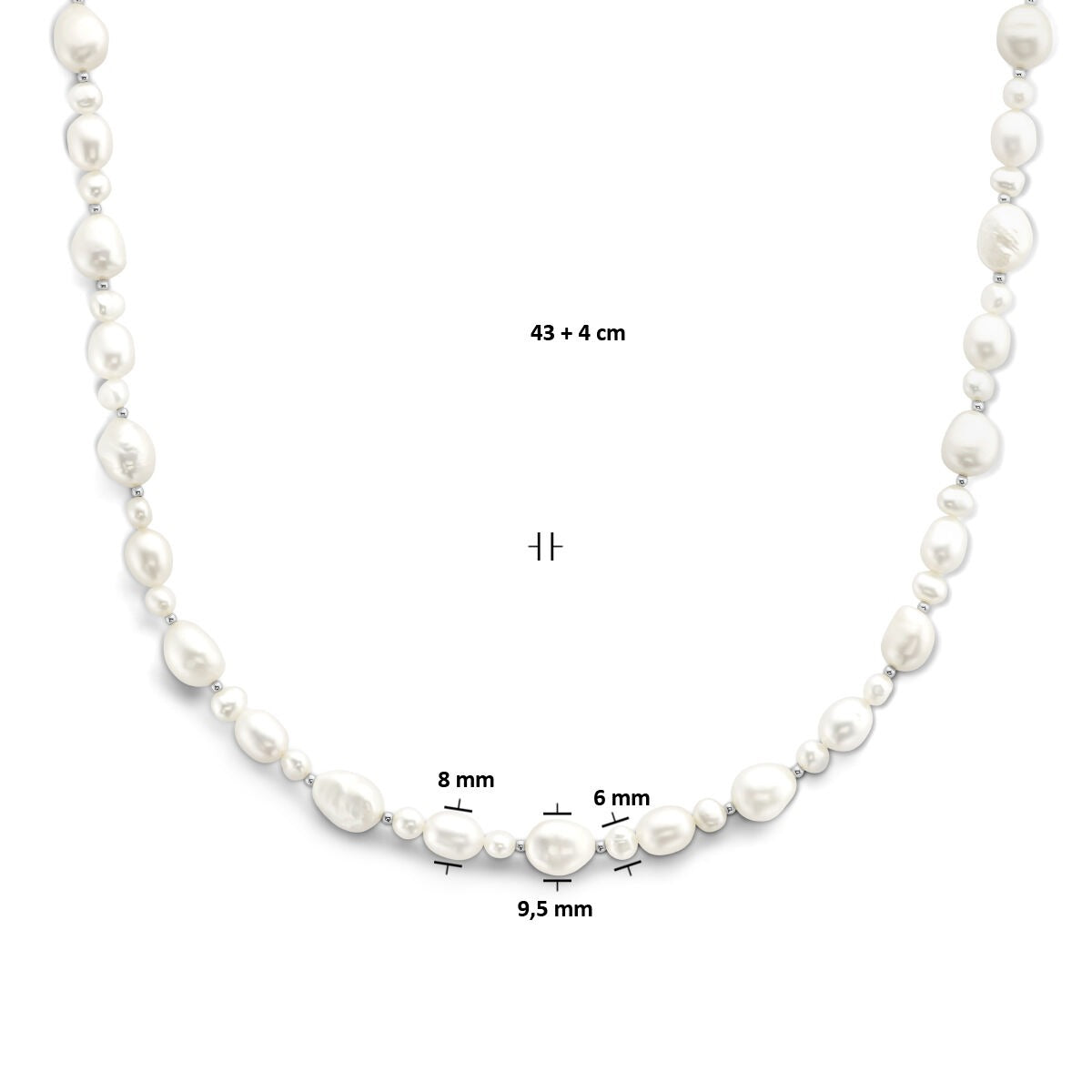 Deze gerhodineerd 925 zilveren parelketting straalt pure elegantie uit, met prachtig glanzende witte zoetwaterparels van ca. 9,5 mm breed. Het collier heeft een draaglengte van 43 cm en is voorzien van een handige extensie van 4 cm, waardoor het moeiteloos aan te passen is aan elke halslijn of gelegenheid.