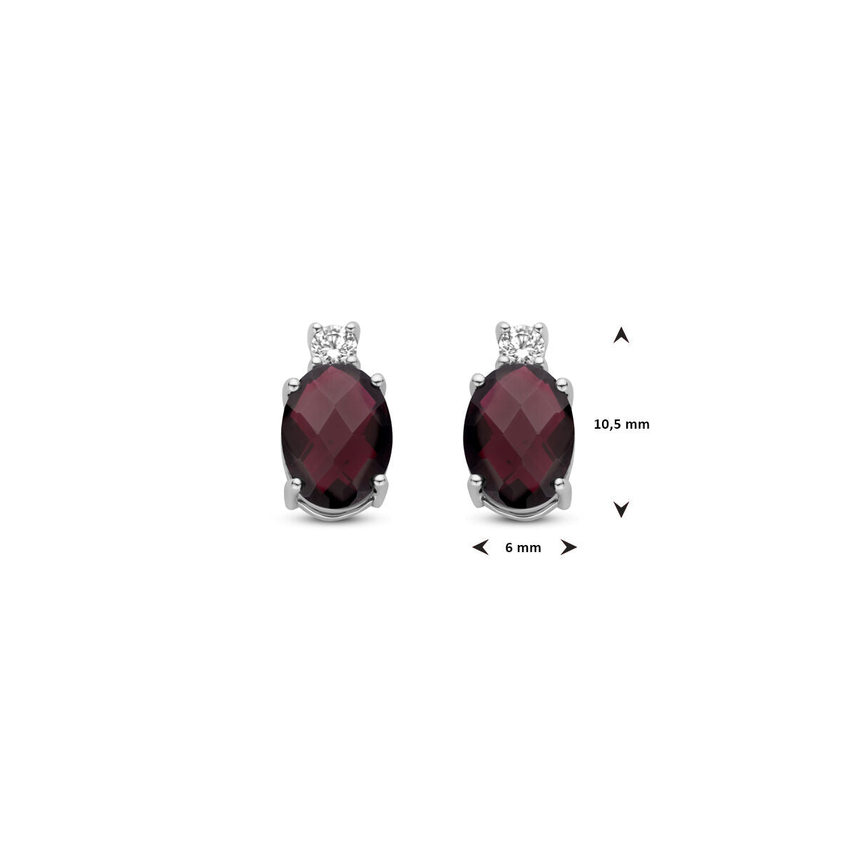 Gerhodineerd 925 zilveren oorknoppen uitgevoerd met granaat en zirkonia. De oorknoppen hebben een afmeting van 10.5x6mm.