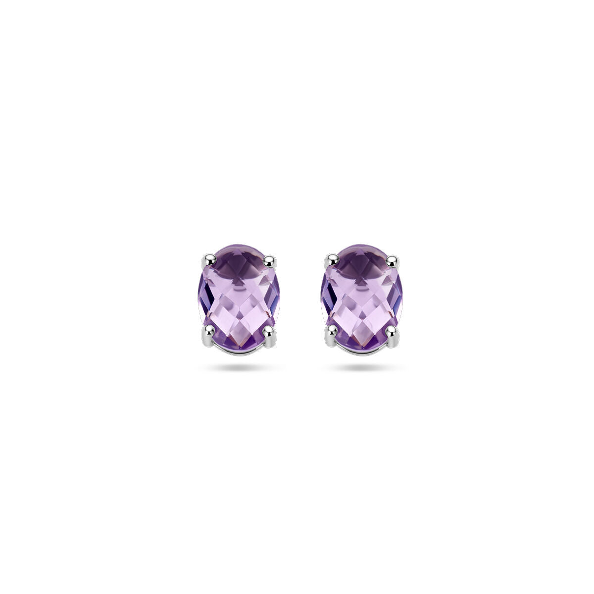 Een paar oorknoppen amethist zilver gerhodineerd van Van der Kooij Collectie, met ovaal geslepen facetgeslepen paarse edelstenen, afgebeeld op een witte achtergrond met één oorbel van de zijkant en de andere van de voorkant.