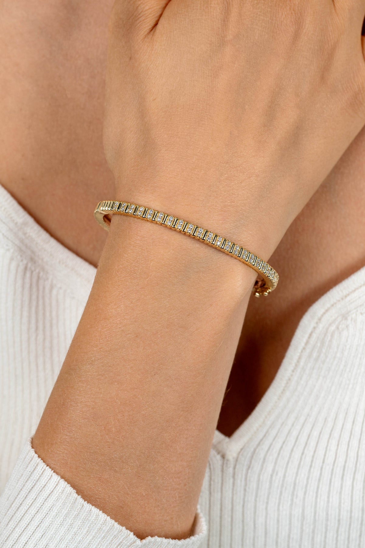 ZINZI gold plated zilveren bangle armband van 4mm breed. Gladde ovale elementen worden afgewisseld door een chatonzetting van twee witte zirkonia's. Maak je look compleet met bijpassende ring en oorringen! Vervaardig van eerste gehalte zilver (925) en extra geel verguld.