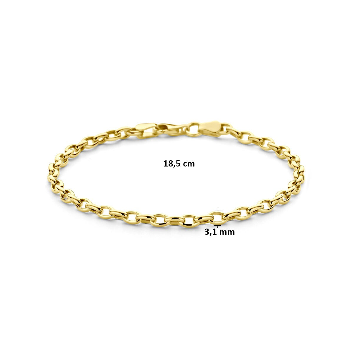 Deze elegante gouden dames armband is vervaardigd uit 9 karaat geelgoud en straalt een subtiele verfijning uit. De klassieke ankerschakel, met een breedte van 3,1 mm, geeft het sieraad een tijdloze uitstraling, terwijl het stevige karabijnslot zorgt voor een veilige sluiting. Dankzij de draaglengte van 18,5 cm valt deze armband mooi om de pols – perfect als solostatement of in combinatie met andere gouden armbanden voor een moderne gelaagde look.