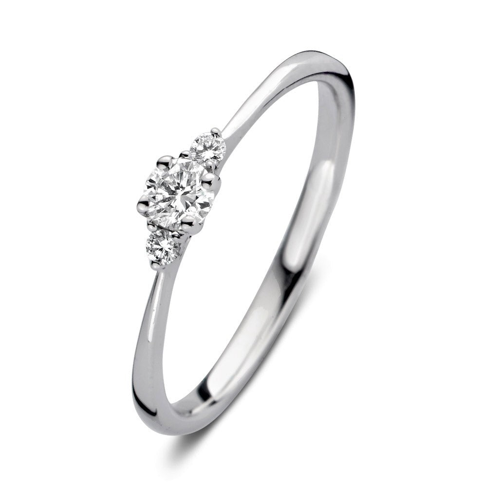 Alix is onze schitterende driesteensring! Zoals de naam al verklapt bevat de ring drie diamanten, waarbij de twee zijstenen de grote middensteen extra laten stralen. Bij een driesteensring staan de drie stenen symbool voor het verleden, heden en de toekomst. Het is daarom een perfecte ring voor speciale gelegenheden als bijvoorbeeld een verloving! We hebben Alix bovendien zo ontworpen dat er een aanschuif- of trouwring tegenaan gedragen kan worden. Wat dacht je bijvoorbeeld van onze Millie ring