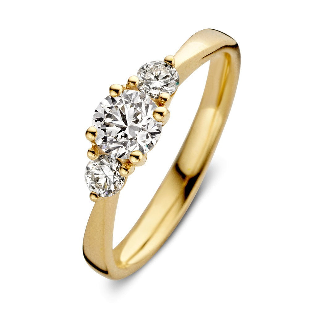 Alix is onze schitterende driesteensring! Zoals de naam al verklapt bevat de ring drie diamanten, waarbij de twee zijstenen de grote middensteen extra laten stralen. Bij een driesteensring staan de drie stenen symbool voor het verleden, heden en de toekomst. Het is daarom een perfecte ring voor speciale gelegenheden als bijvoorbeeld een verloving! We hebben Alix bovendien zo ontworpen dat er een aanschuif- of trouwring tegenaan gedragen kan worden. Wat dacht je bijvoorbeeld van onze Millie ring?