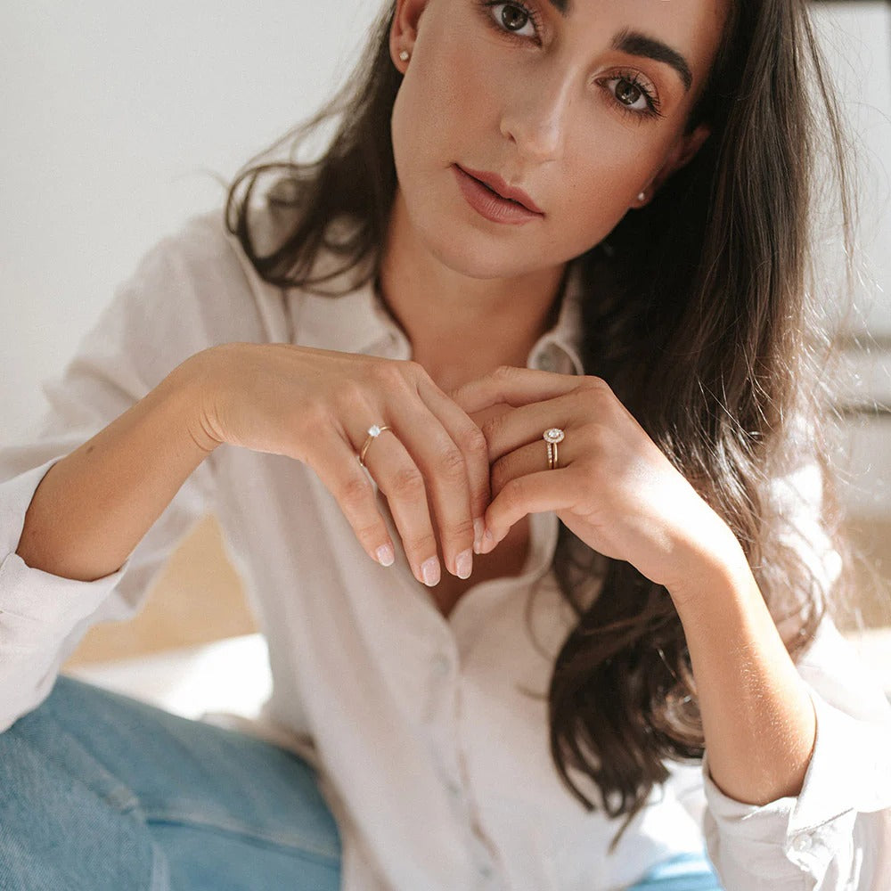Ring Olivia is onderdeel van een set, in onze collectie zijn bijpassende oorbellen en een collier te vinden. De solitair is perfect te combineren met onze diamanten rijring Millie.
