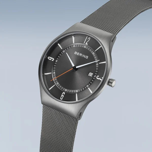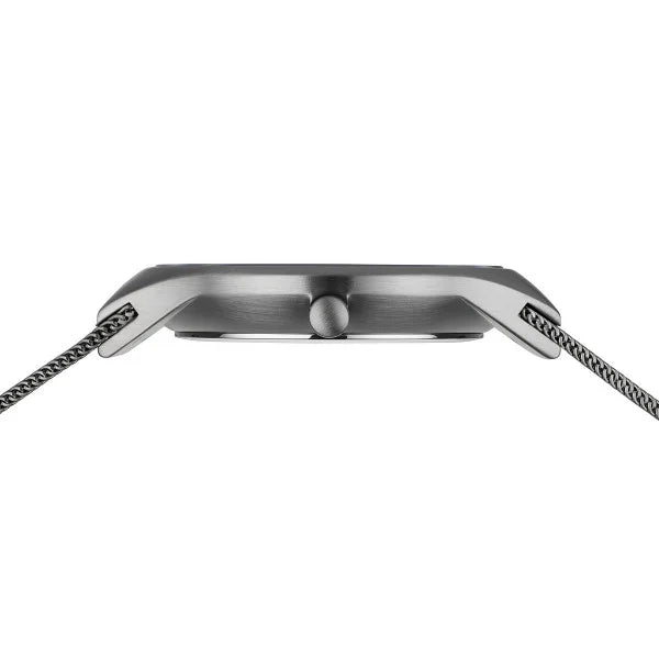 Das Edelstahlgehäuse mit 40 mm Durchmesser strahlt Robustheit aus und die Uhr wiegt 80 Gramm für ein robustes und dennoch angenehmes Tragegefühl. Das graue Milanaise-Armband verleiht einen Hauch von modernem Stil.