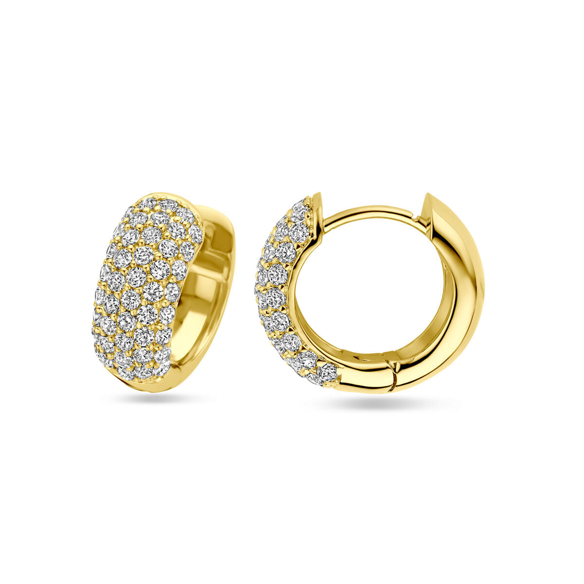 Een paar Van der Kooij Collectie klapoorringen zirkonia 15,5 mm, 1 micron zilver verguld (geel), met fonkelende zirkonia steentjes aan de voorkant.
