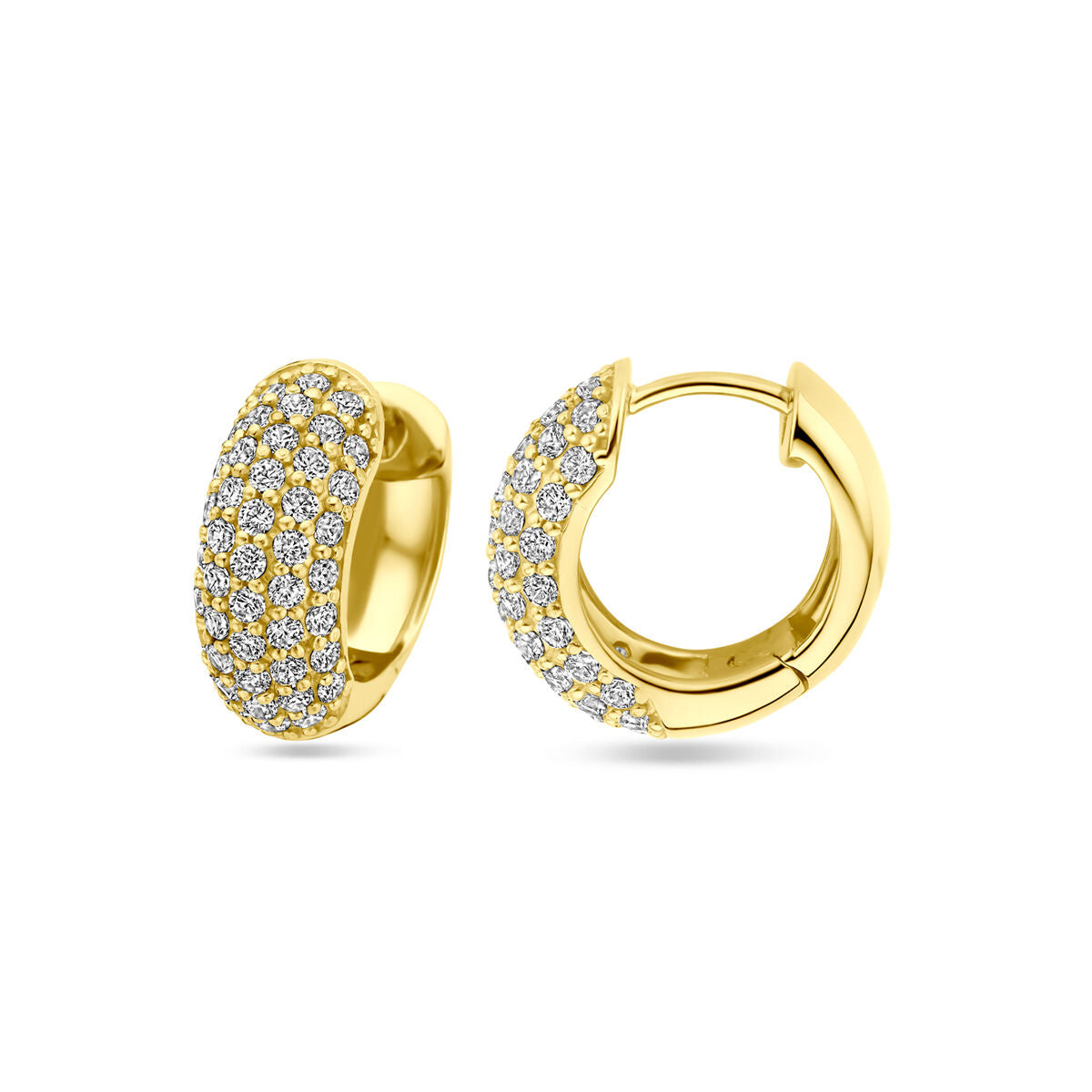 Van der Kooij Collectie klapoorringen zirkonia 16,5 mm, 1 micron geel verguld zilver. Deze oorbellen zijn bezet met kleine ronde witte stenen en hebben een afgerond, licht chunky design voor een moderne uitstraling.