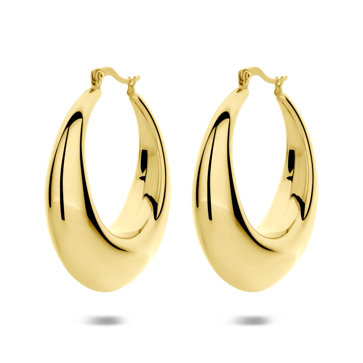 Deze goudkleurige stalen oorringen met een royale afmeting van 46 x 12 mm zijn een stijlvolle eyecatcher voor wie houdt van uitgesproken eenvoud. Het minimalistische design krijgt een luxueuze uitstraling dankzij de warme goudkleurige ion plating, die niet alleen zorgt voor een rijke glans, maar ook extra kras- en slijtbestendig is.