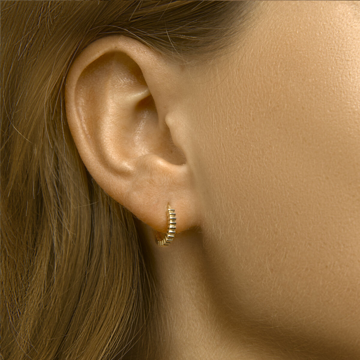 Een close-up toont een vrouwenoor met lichtbruin haar, dat een kleine klapoorring draagt uit de Van der Kooij Collectie, vervaardigd in 14 karaat geelgoud met een geribbeld ontwerp. Hierdoor komt het elegante damessieraad mooi tot zijn recht tegen een zacht onscherpe achtergrond.