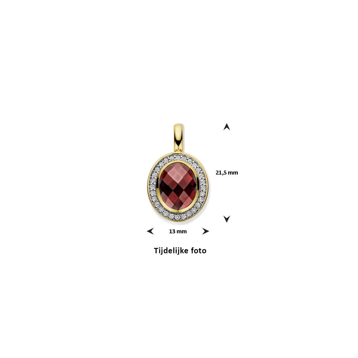 Deze 14 karaat geelgouden hanger combineert warmte en elegantie in een betoverend ontwerp. De blikvanger is een dieprode, ovaal geslepen granaat, die met zijn rijke kleur direct de aandacht trekt. De edelsteen is verfijnd gezet in een klassieke zetkast, omringd door sprankelende diamanten met een totaalgewicht van 0.18 ct en zuiverheid SI2, die zorgen voor een subtiel maar luxueus lichtspel.
