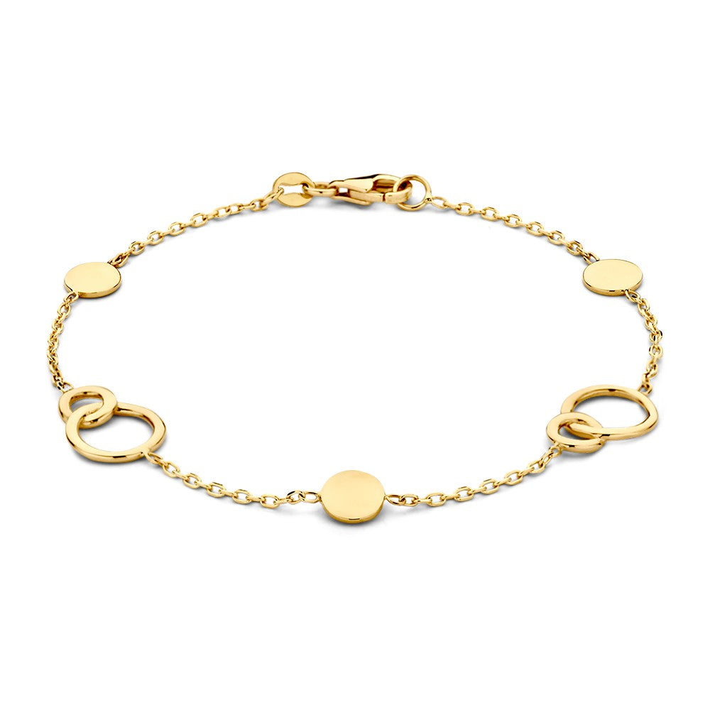 Geelgouden armband met gouden elementen van verbonden cirkels.