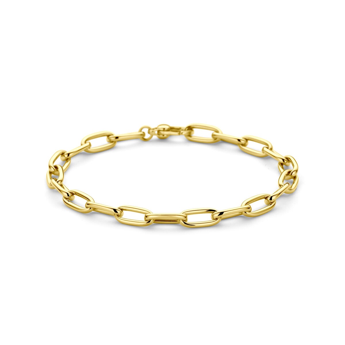Deze 14k geelgouden armband is een verfijnd en stijlvol sieraad met een moderne uitstraling. De schakelstructuur bestaat uit een combinatie van ronde en rechthoekige draadschakels, wat zorgt voor een speelse en luchtige look zonder aan elegantie in te boeten.