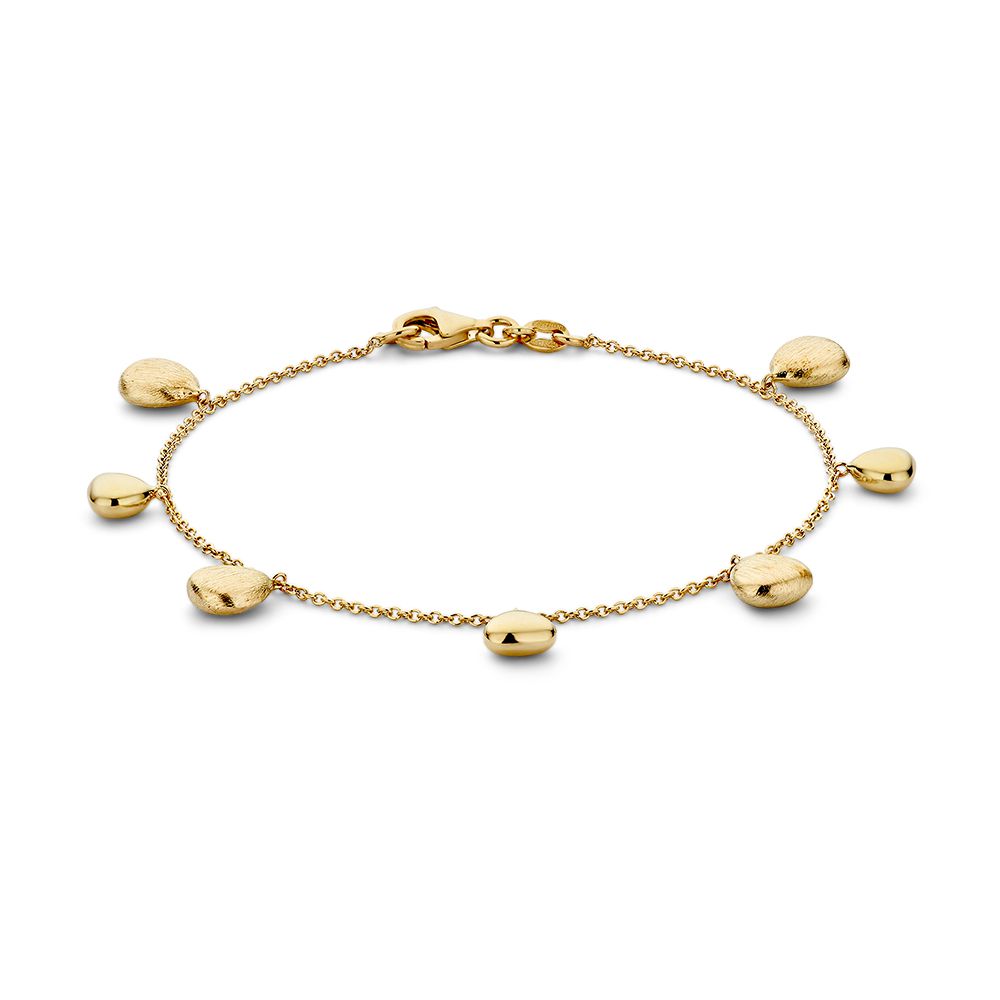 Geelgouden armband met hangende elementen in een matte en gepolijste bewerking. Een plaatje aan iedere damespols!