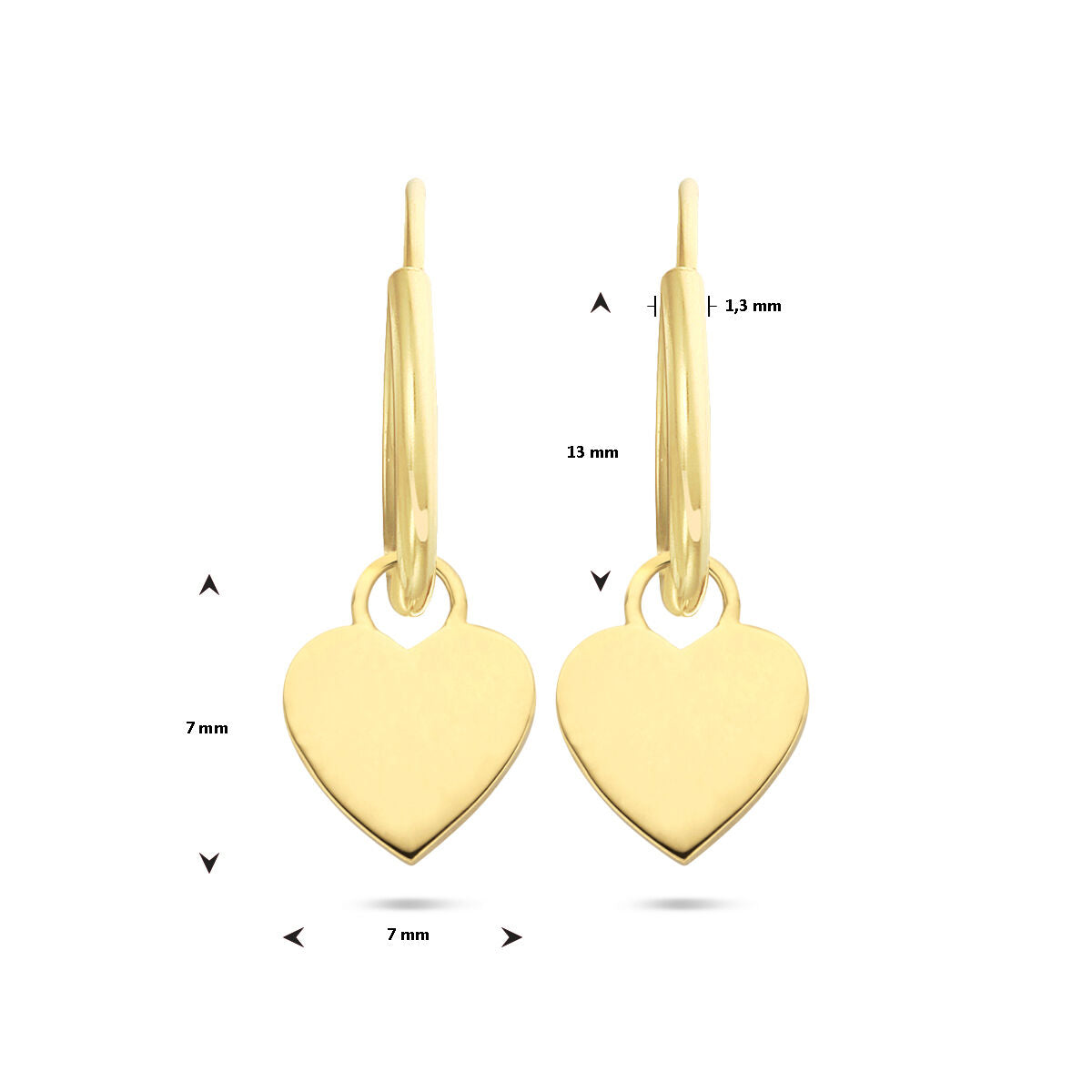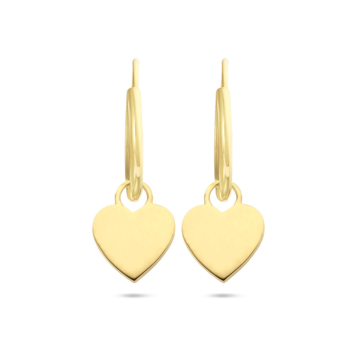 Ohrringe aus 14-karätigem Gelbgold mit Herzanhänger. Die Ohrringe haben einen Durchmesser von 13 mm.