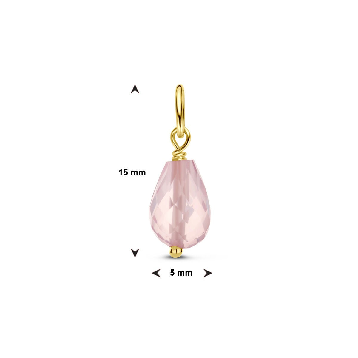Deze 14 karaat geelgouden hanger ademt zachtheid en elegantie. De lichtroze rozenkwarts is briolette geslepen, wat zorgt voor een subtiele schittering bij elke beweging. Met een lengte van 15 mm en een breedte van 5 mm vormt de hanger een verfijnde blikvanger, perfect voor wie houdt van sieraden met een romantisch karakter.