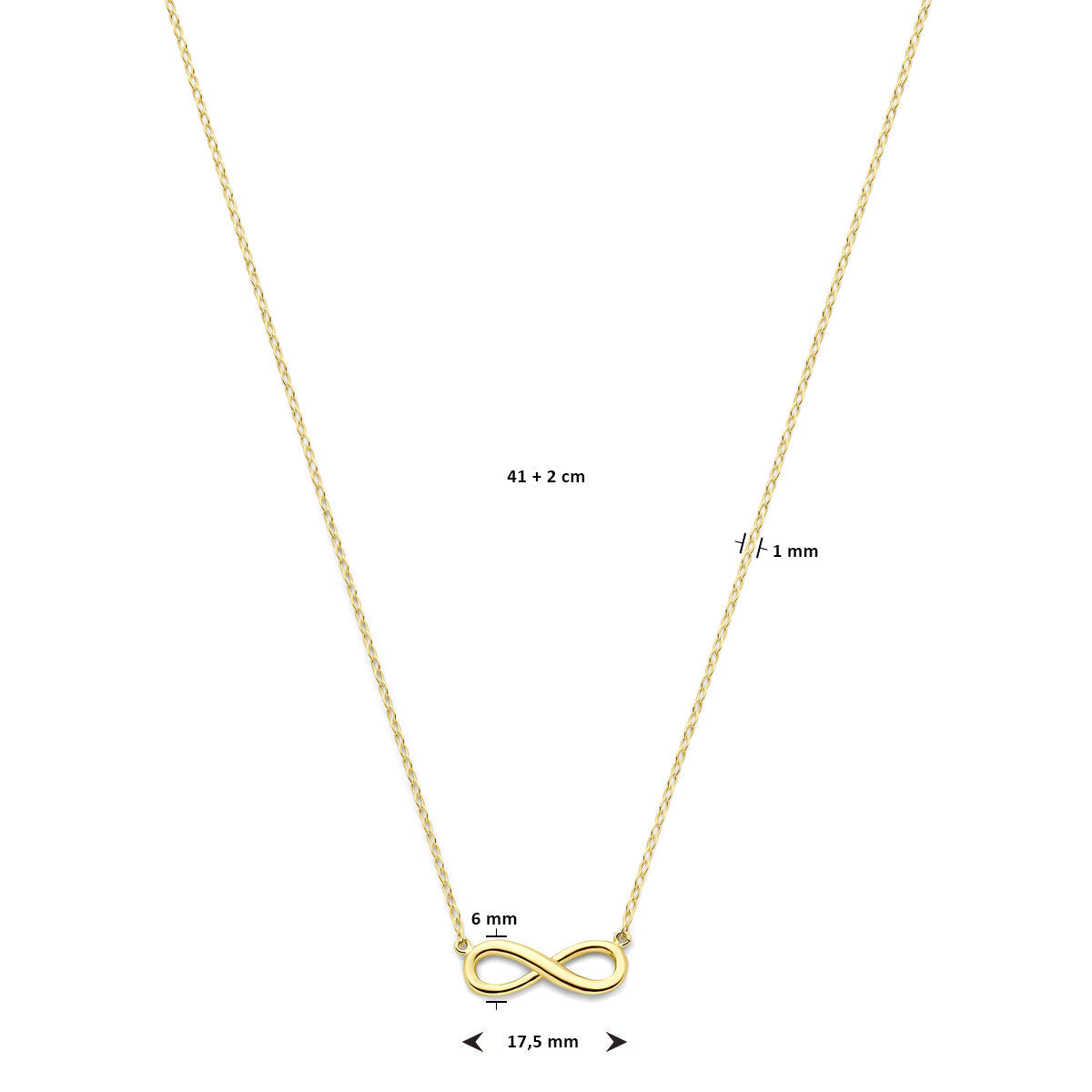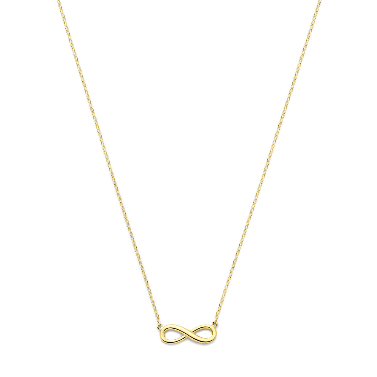 Het Van der Kooij Collectie collier infinity 41 + 2 cm 14K geelgoud is een delicaat dames sieraad met een dunne ketting en kleine infinity hanger (17,5 x 6 x 1 mm).