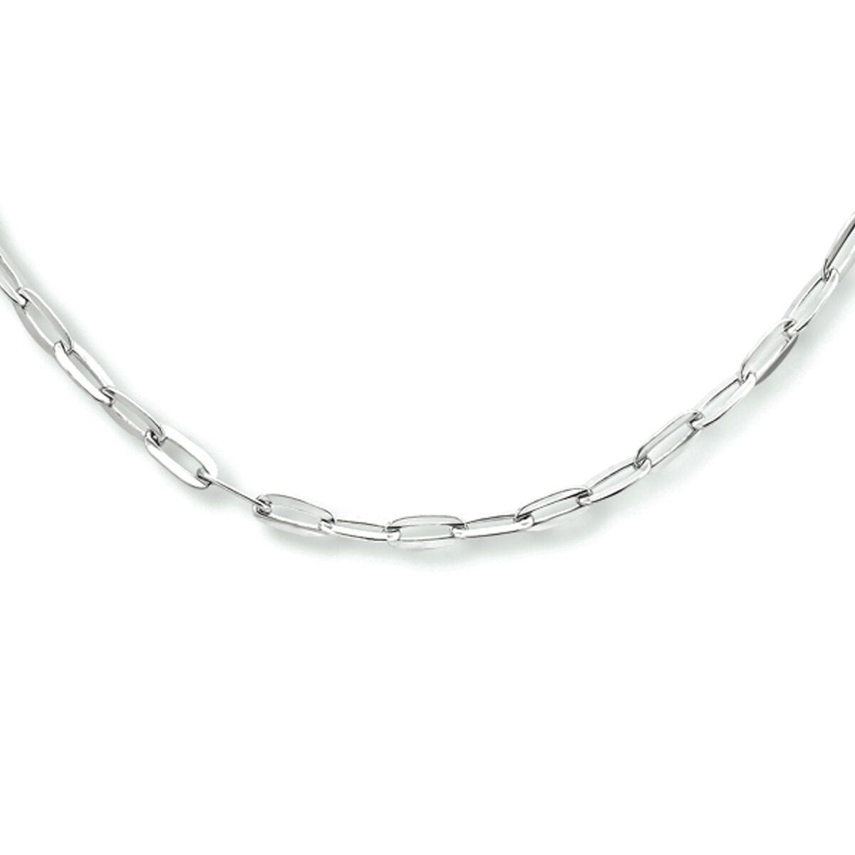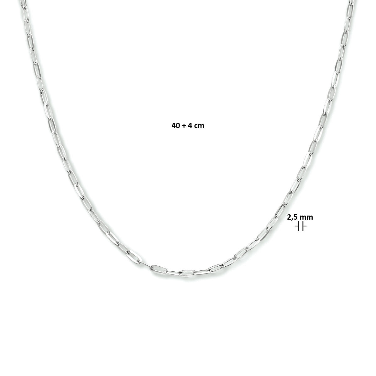Rhodinierte Büroklammer-Halskette aus 925er Silber mit Karabinerverschluss. Die Halskette hat eine Tragelänge von 40cm und eine Verlängerung von 4cm. Die Gliederbreite beträgt 2,5 mm.
