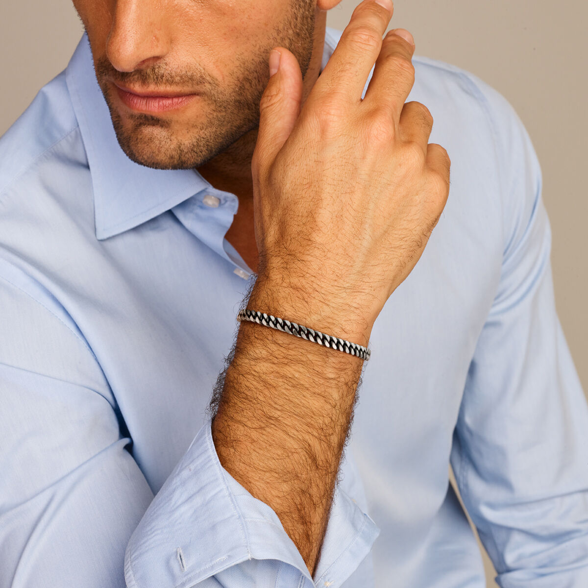Längesstück aus oxidiertem 925er Silber mit einer Gliederbreite von 5 mm. Ausgestattet mit einem Karabinerverschluss.