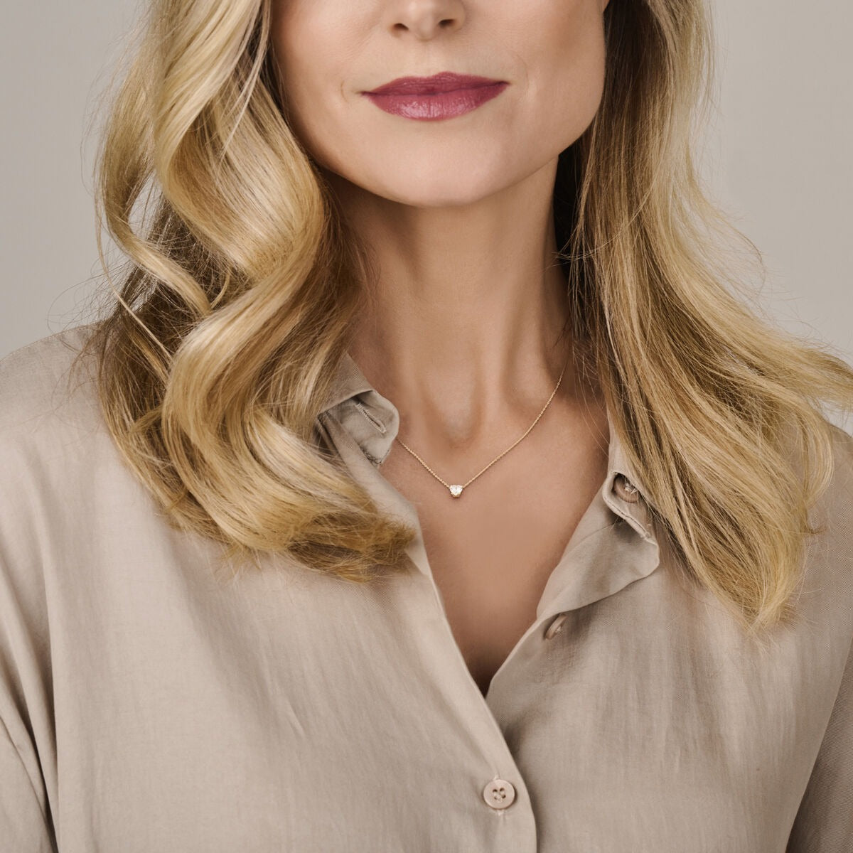 Halskette aus 14-karätigem Gelbgold mit einem Herz-Zirkonia. Die Halskette hat Tragelängen von 41, 43 und 45cm. Ausgestattet mit Karabinerverschluss. Die Gliederbreite beträgt 1mm.