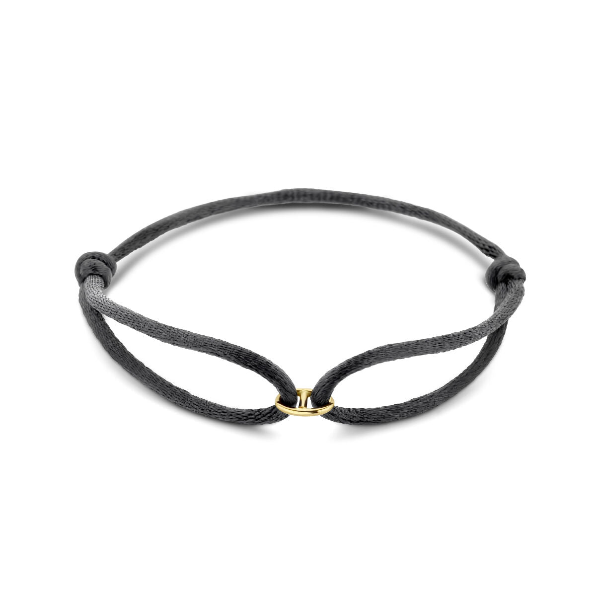 Schwarzes geflochtenes Armband mit einem Element aus 14 Karat Gelbgold. Das Armband hat Tragelängen von 13 bis 26 cm.