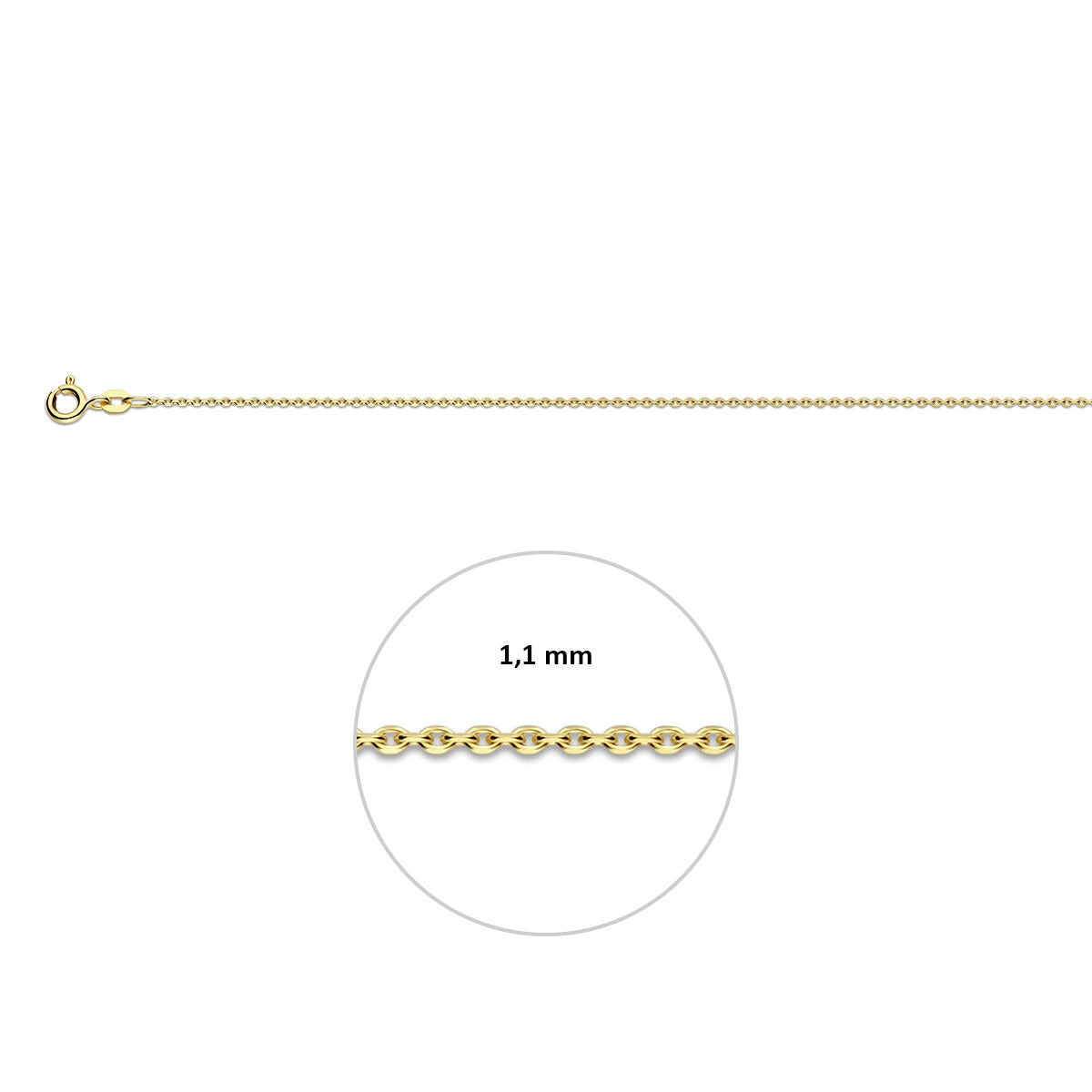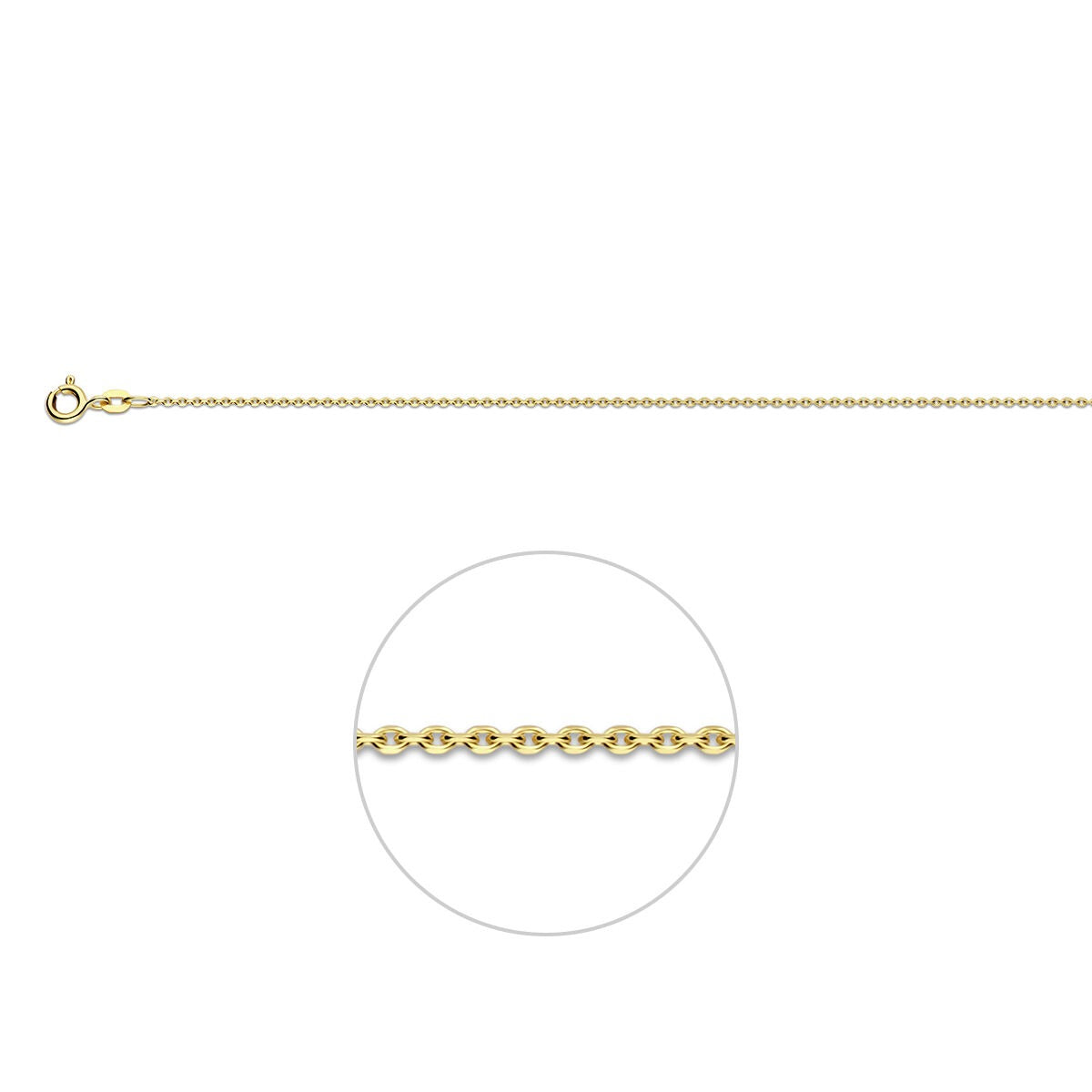 Deze 9k geelgouden ketting zonder hanger is een verfijnd sieraad met een subtiele schittering. De ketting is uitgevoerd met een gediamanteerde ankerschakel van 1,1 mm breed, waarbij de fijne facetten in de schakels het licht prachtig weerkaatsen. Hierdoor krijgt deze gouden ketting een levendige glans en een elegante uitstraling die zowel tijdloos als modern aanvoelt.