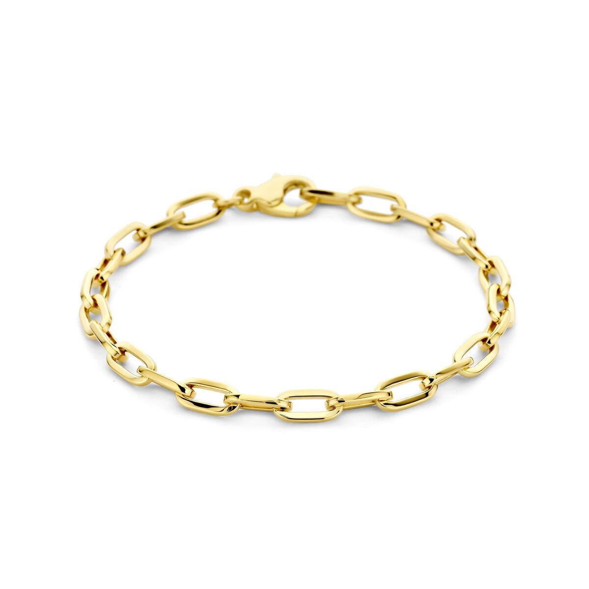 Deze 14 karaat geelgouden armband straalt kracht en elegantie uit in één vloeiende lijn. De anker schakels, met een breedte van 4,7 mm, geven het sieraad een klassieke en toch robuuste uitstraling die moeiteloos aansluit bij elke stijl – van alledaags tot feestelijk. De warme glans van het geelgoud onderstreept het vakmanschap waarmee deze armband is vervaardigd, en de solide karabijnsluiting zorgt voor een veilige en comfortabele draagervaring.