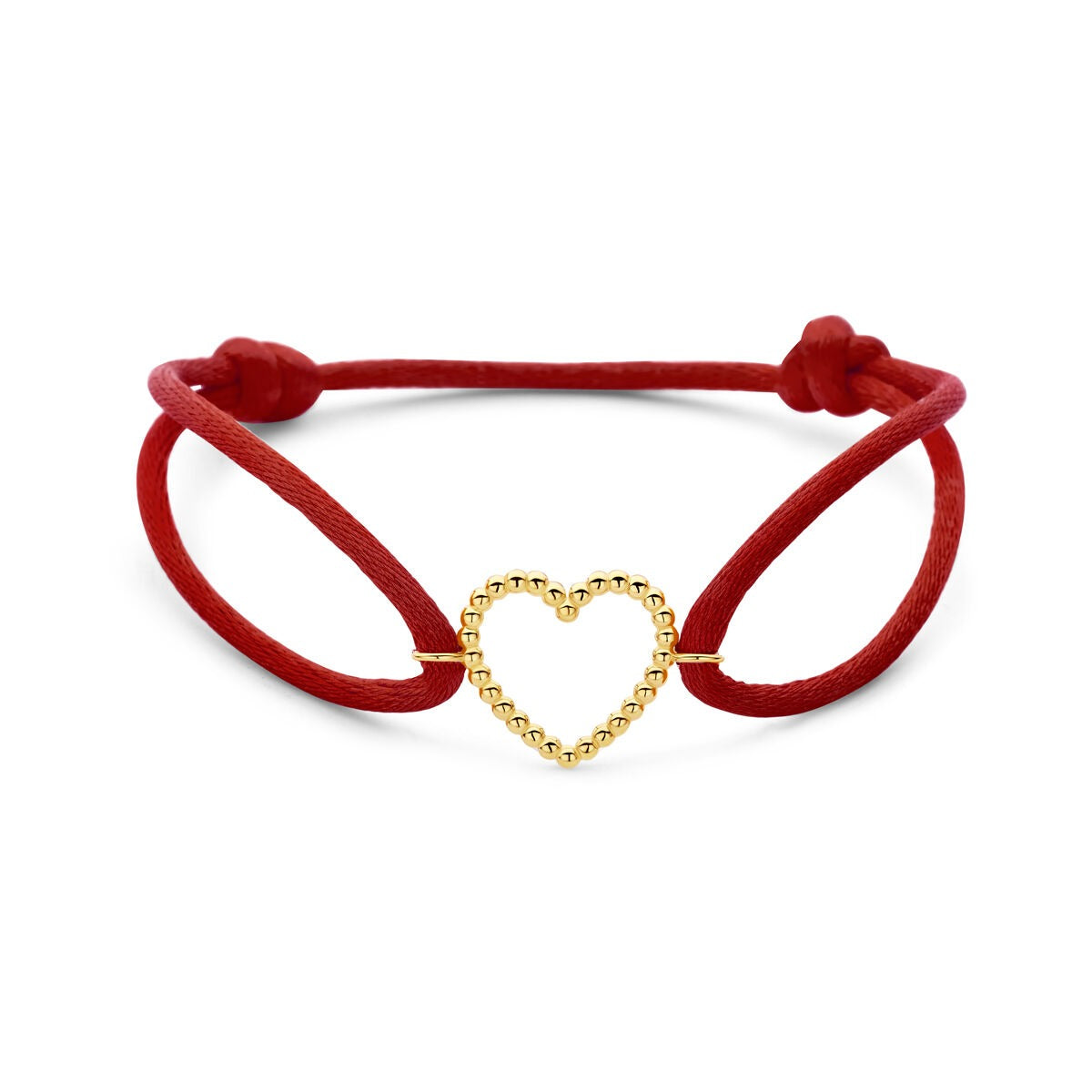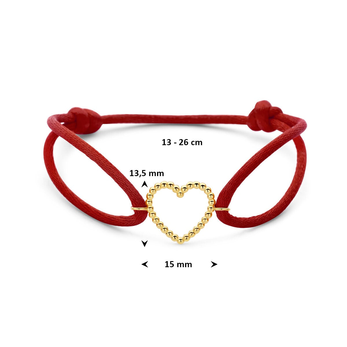 Een subtiel gebaar met een groots gevoel: deze verfijnde satijnen armband is uitgevoerd in warmrood satijn en wordt gesierd door een prachtig 14k geelgouden hartje van 13,5 x 15 mm. Het glanzende goud vormt een elegant contrast met het diepe rood van het satijn, waardoor dit sieraad een romantische en tegelijkertijd moderne uitstraling krijgt.