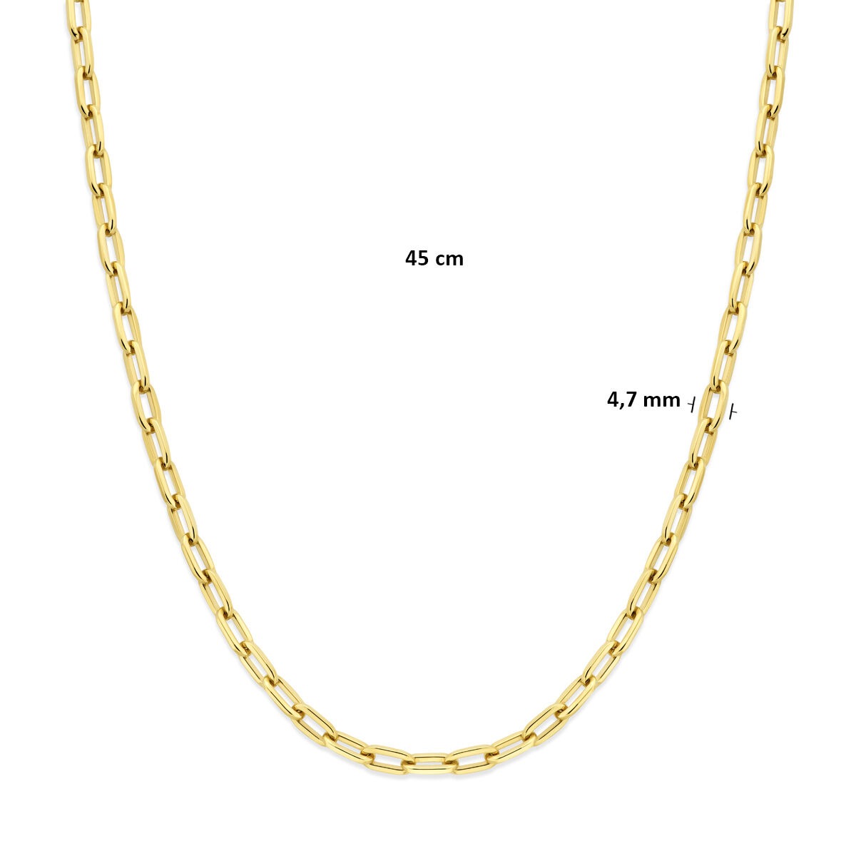 Deze verfijnde gouden dames ketting is een tijdloos sieraad met een krachtige uitstraling. Vervaardigd uit 14 karaat geelgoud en uitgevoerd met elegante anker schakels van 4,7 mm breed, straalt dit collier klassieke klasse uit met een moderne touch.