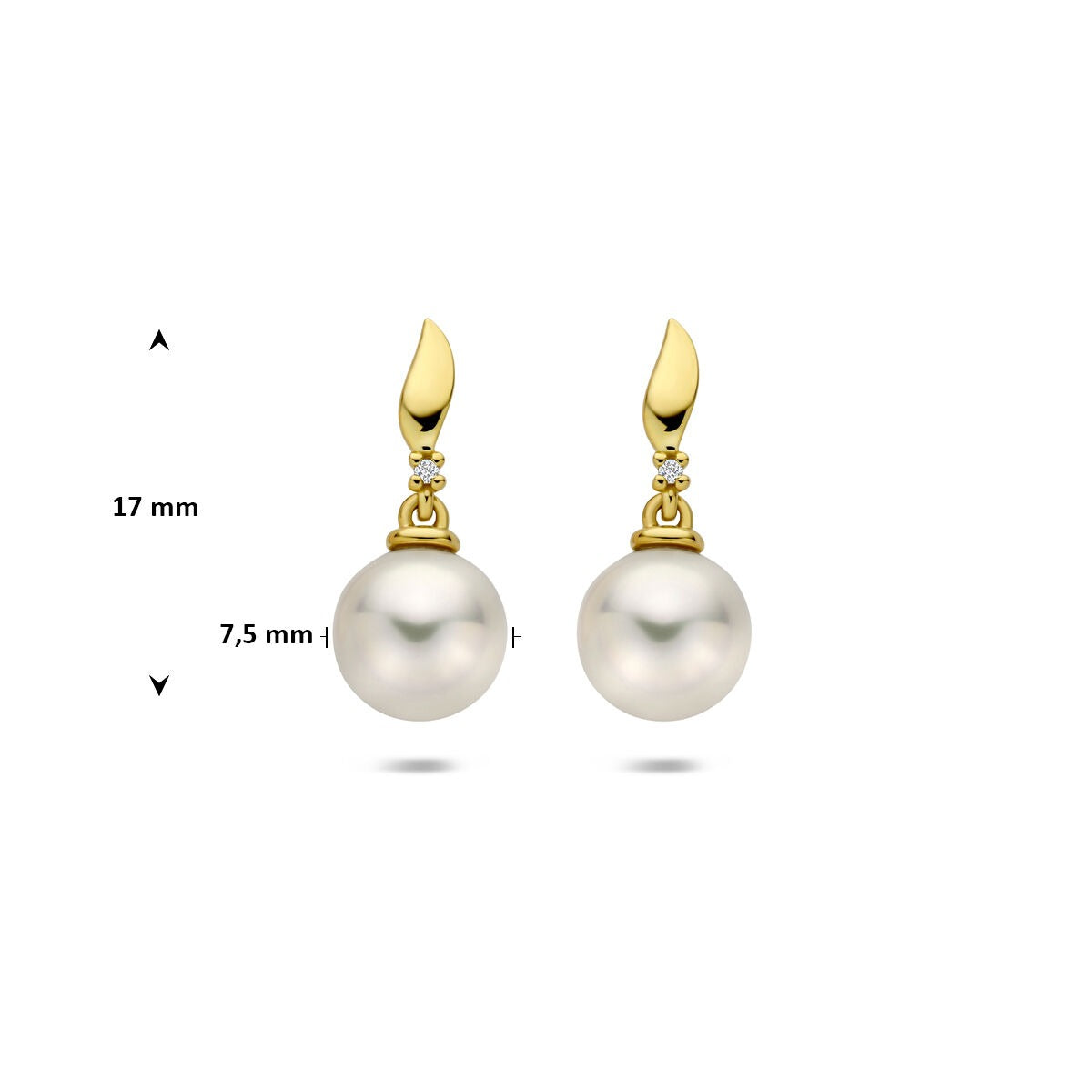 Deze verfijnde gouden oorhangers met diamant en parel stralen een tijdloze elegantie uit. Vervaardigd uit 14 karaat geelgoud combineren ze de warme glans van edelmetaal met de zachte charme van witte parels van 7,5 mm. Boven elke parel schittert een briljant geslepen diamant van 0,01 ct in een klassieke chatonzetting – een subtiel detail dat het geheel net dat beetje extra luxe geeft.