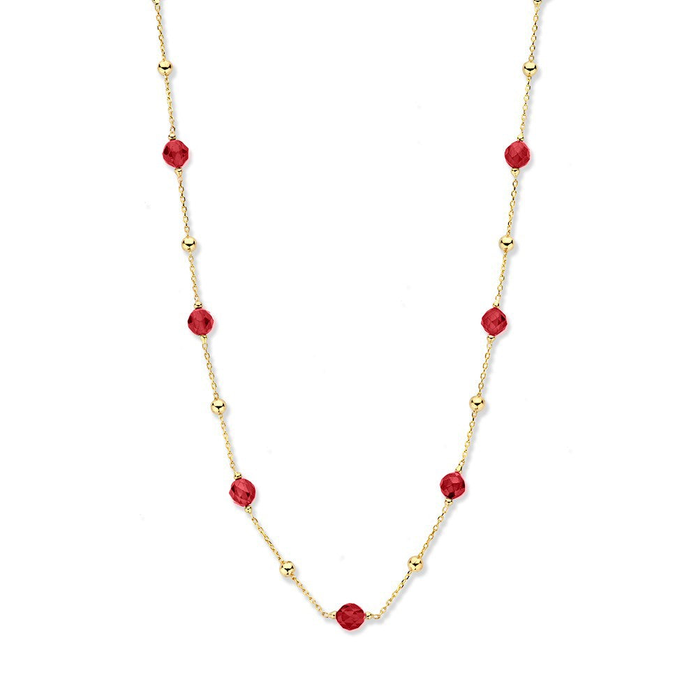 Geelgouden collier met gouden bolletjes en rode zirkonia elementen. Voeg kleur toe aan jouw sieraden look!