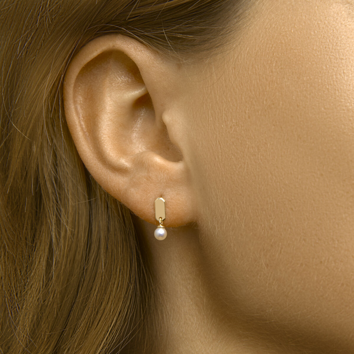 Ohrringe aus 14-karätigem Gelbgold mit einer wunderschönen Perle. Die Ohrringe haben eine Gesamthöhe von 1,1 cm und eine Breite von 3 mm.